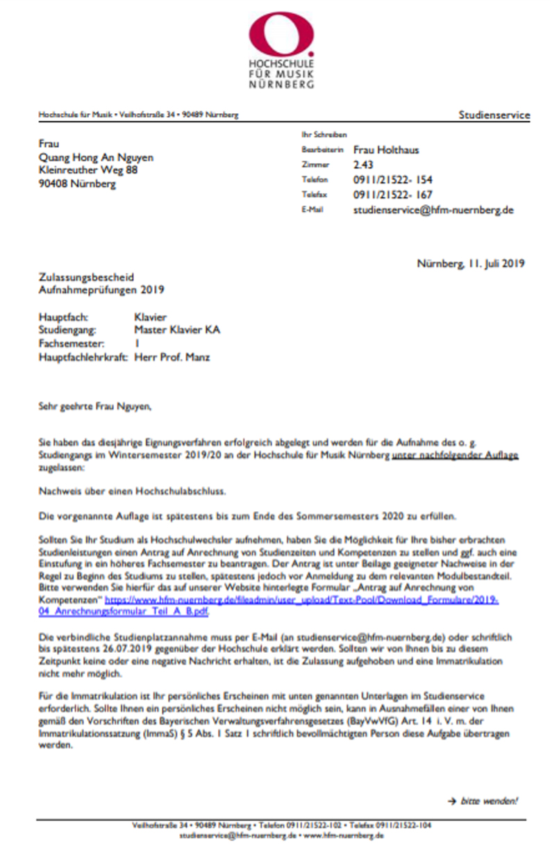 Thư cho ở lại Đức và nhận vào học trình Thạc sĩ Âm nhạc