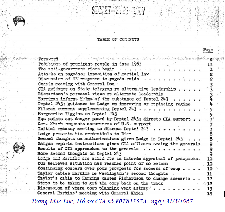 Một hồ sơ của Cục Trung Ương Tình Báo CIA mang mã số 80T01357A được giải mật và nhập vào Văn khố Quốc gia (NARA danh số 104-10214-10035) đã đưa ra một số chi tiết về những ngày sau khi chính phủ ông Ngô Đình Diệm tấn công các chùa VN, cho tới khi hoàn tất cuộc cách mạng của quân lực VNCH để lật đổ chế độ này. Hồ sơ nầy có tựa đề “DIEM REPORT (REPORT ON CIA AND U.S. GOVT INVOLVEMENT IN THE VIETNAMESE GENERALS’ COUP FO 1 NOVEMBER 1963” [Phúc trình về Diệm (Phúc trình về sự tham dự của CIA và Chính phủ Mỹ trong Cuộc Đảo chánh 1-11-1963].
