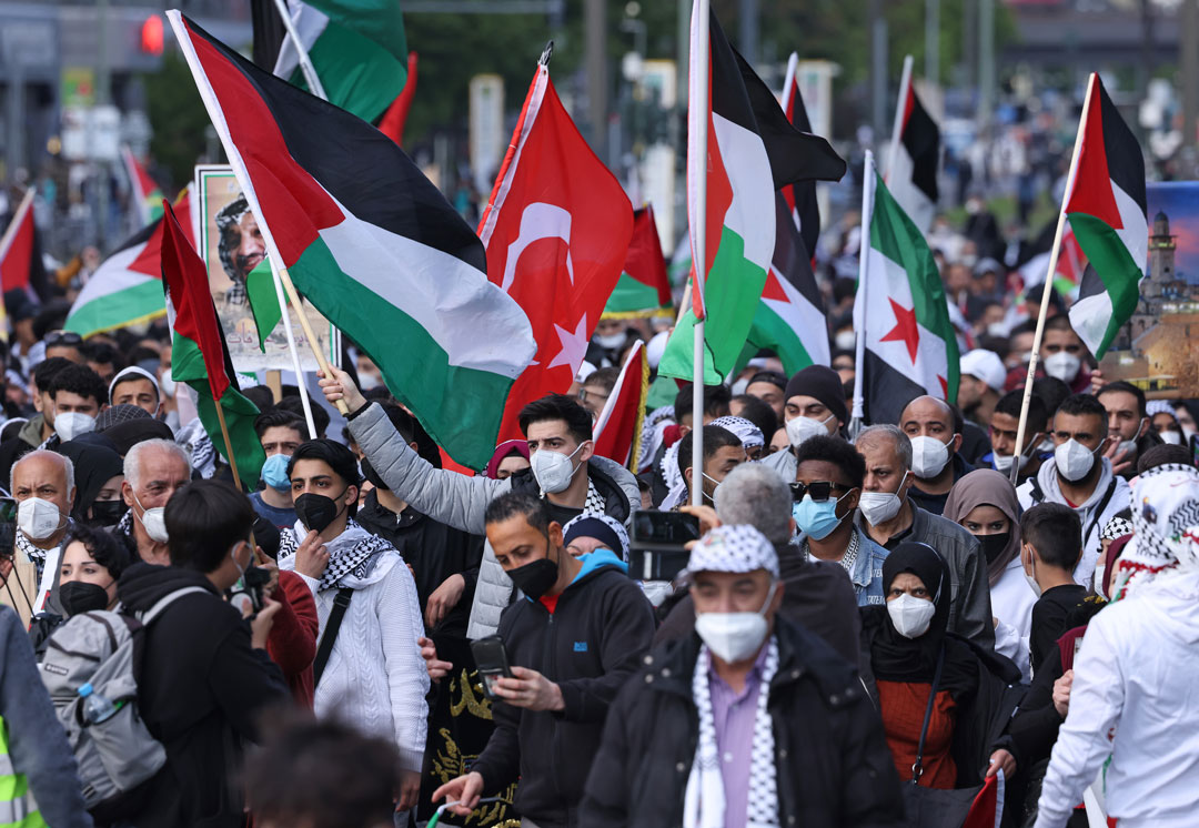 Đoàn người biểu tình đòi quyền của người dân Palestine và chống lại các cuộc không kích của Do Thái tại Dải Gaza trong cuộc tuần hành hôm 19 tháng 5 năm 2021 tại Berlin, Đức Quốc. Những người biểu tình đã tràn ra các đường phố khắp Âu Châu kể từ tuần trước vì cuộc xung đột hiện nay giữa Palestine và Do Thái. (Photo Getty Images)
