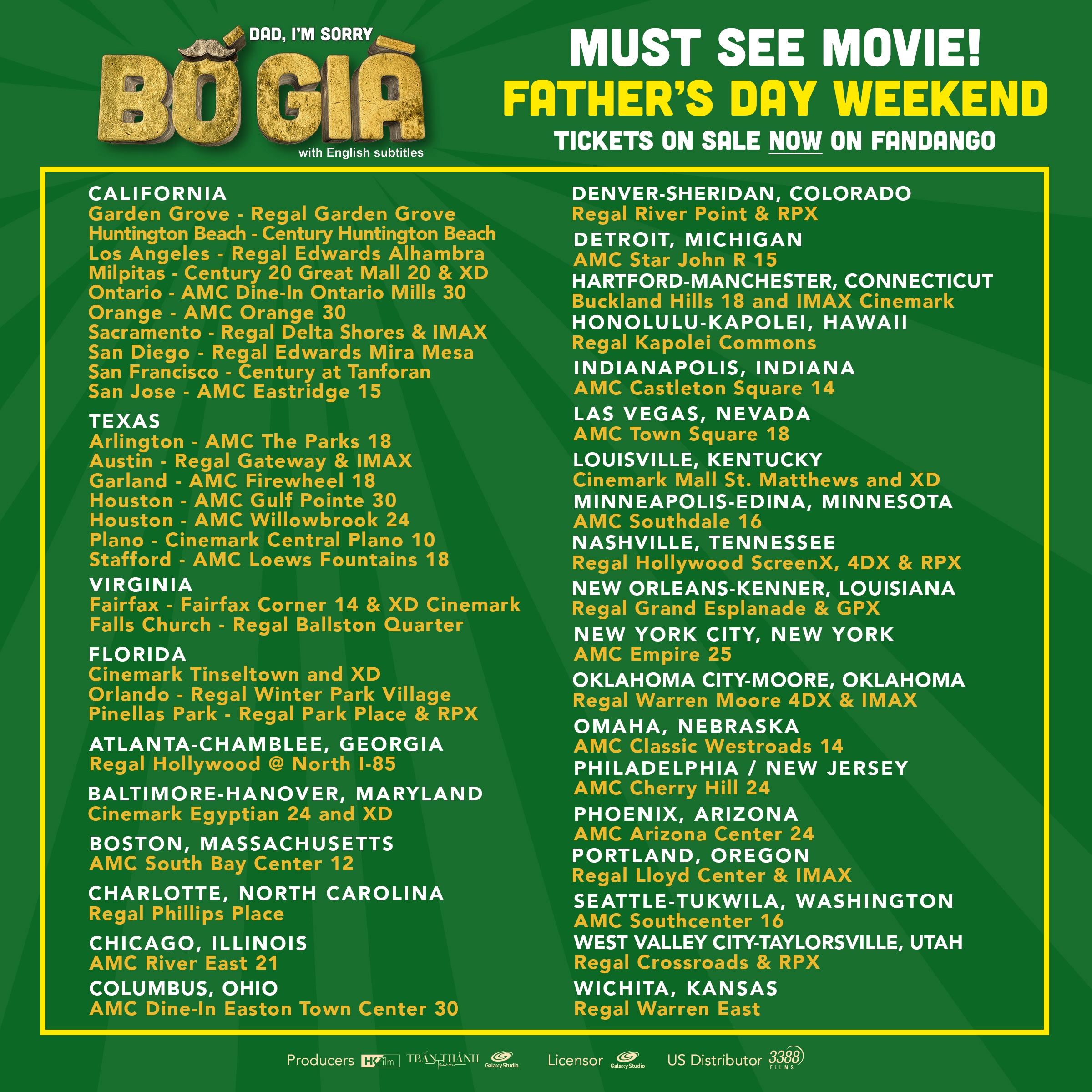 Bố Già (Dad, I’m Sorry) do Trấn Thành và Vũ Ngọc Đãng đồng đạo diễn; Trấn Thành Town, Galaxy Studio, HK Film đồng sản xuất; 3388 Films phát hành tại Bắc Mỹ.