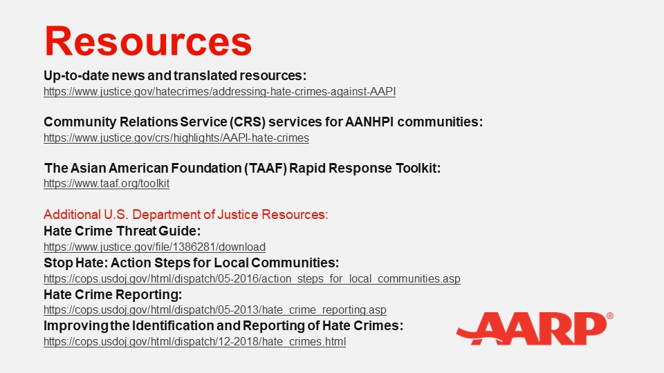Buổi thảo luận #StopAsianHate của AARP là một phần trong cam kết của AARP để hoàn thành lời hứa của Hiệp hội Liên Minh Các Nhà Quảng Cáo Toàn Quốc về Việc Tiếp Thị Đa Văn Hóa Toàn Diện để thể hiện lập trường chống lại sự thù hận và bạo lực nhằm vào cộng đồng người Mỹ gốc Á và gốc đảo Thái Bình Dương. Để xem buổi thảo luận đầu tiên về chủ đề “Bênh Vực Cho Những Người Lớn Tuổi của Chúng Ta” hoặc xem lại buổi thảo luận này về chủ đề “Bảo Vệ Những Người Lớn Tuổi Trong Cộng Đồng AAPI Của Chúng Ta Bằng Các Dữ Liệu”, xin vui lòng ghé vào trang Facebook AARP AAPI Community (@AARPAAPI).