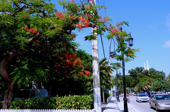 Ra đường tôi chú ý ngay giá xăng, chưa đến 3 đô một gallon, rẻ hơn vùng Vịnh San Francisco đến 1 đô. Chạy xa lộ cứ một đoạn lại thấy máy nháy đèn tính lộ phí. Trên đường thấy phượng còn lác đác hoa. Vào những con đường nhỏ có phượng nhiều hơn. Nhớ lại một lần từ Miami đi Cuba vào tháng Sáu, khi máy bay cất cánh, qua cửa sổ tôi đã thấy cả một vùng đỏ rực bên dưới.