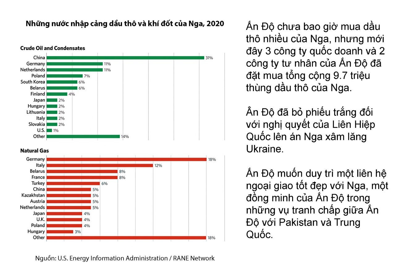 Ấn Độ thông thường nhập cảng 80% dầu khí từ Iraq, Saudi Arabia, United Arab Emirates và Nigeria và khoảng 2% - 5% dầu thô từ Nga. Tuy nhiên trong thời gian gần đây, Ấn Độ gia tăng mua dầu thô giảm giá đáng kể từ Nga. Giá giảm 20% là một mức đáng kể với 80% nhu cầu dầu nhập cảng, đặc biệt sau đại dịch Covid và kinh tế trì trệ. Ngoài ra, Ấn Độ muốn duy trì một liên hệ ngoại giao tốt đẹp với Nga, một đồng minh của Ấn Độ trong những cuộc tranh chấp với Trung Quốc, Pakistan. Ngoài ra, Ấn Độ mua 60% võ khí của Nga.