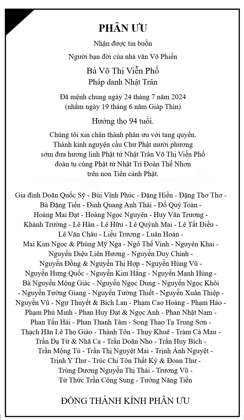 Gia đình chúng tôi vô cùng thương tiếc báo tin cùng quý thân bằng quyến thuộc và bạn hữu gần xa: Mẹ, Bà Nội, Bà Ngoại, Bà Cố của chúng tôi là: Bà Quả Phụ ĐỖ ĐÌNH HOÀNH Khuê Danh NGUYỄN THỊ HAI Pháp Danh Diệu Thanh Sinh ngày 15 tháng 8 năm 1933 tại Việt Nam Đã từ trần vào lúc 4 giờ sáng ngày 12 tháng 11 năm 2025 (nhằm ngày 23 tháng 9 năm Ất Ty.) tại Bệnh Viện St Mary Long Beach California Hưởng Thọ 93 tuổi