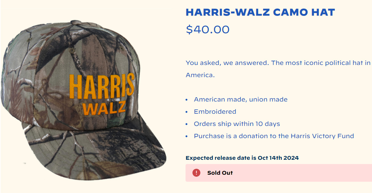 ⦿ ---- Trong vòng 24 giờ, chiến dịch Harris-Walz đã chứng minh rằng họ có thể theo kịp văn hóa trực tuyến, di chuyển với tốc độ của internet để tung ra một dòng mũ lưỡi trai ngụy trang - dựa trên thiết kế lan truyền của người dùng mạng xã hội - đã bay khỏi các kệ hàng. Chiến dịch nói với báo Teen Vogue vào thứ Tư rằng họ đã thu về hơn 1 triệu đô la từ doanh số bán mũ, được bán lẻ với giá 40 đô la.