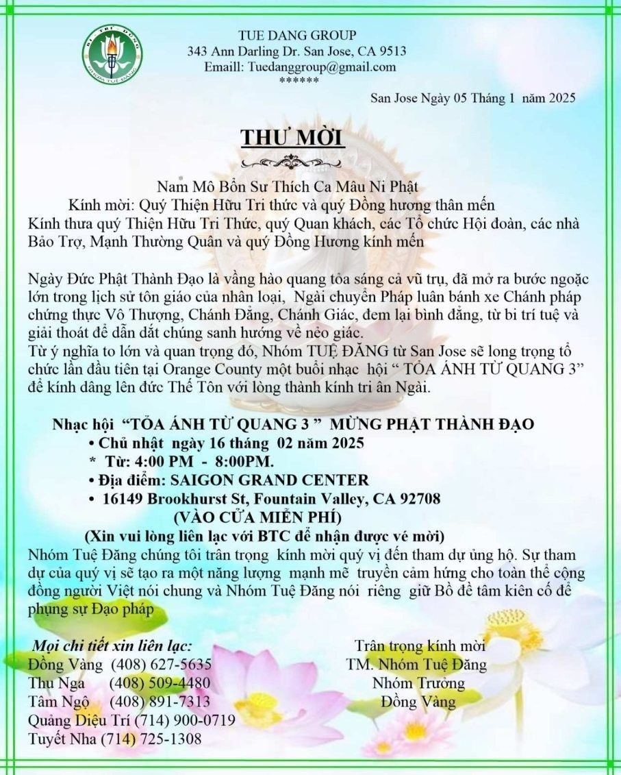 ⦿ ---- NHẠC HỘI TỎA ÁNH TỪ QUANG 3 "MỪNG PHẬT THÀNH ĐẠO" do NHÓM TUỆ ĐĂNG sẽ long trọng tổ chức tại SAIGON GRAND CENTER - FOUNTAIN VALLEY, ORANGE COUNTY