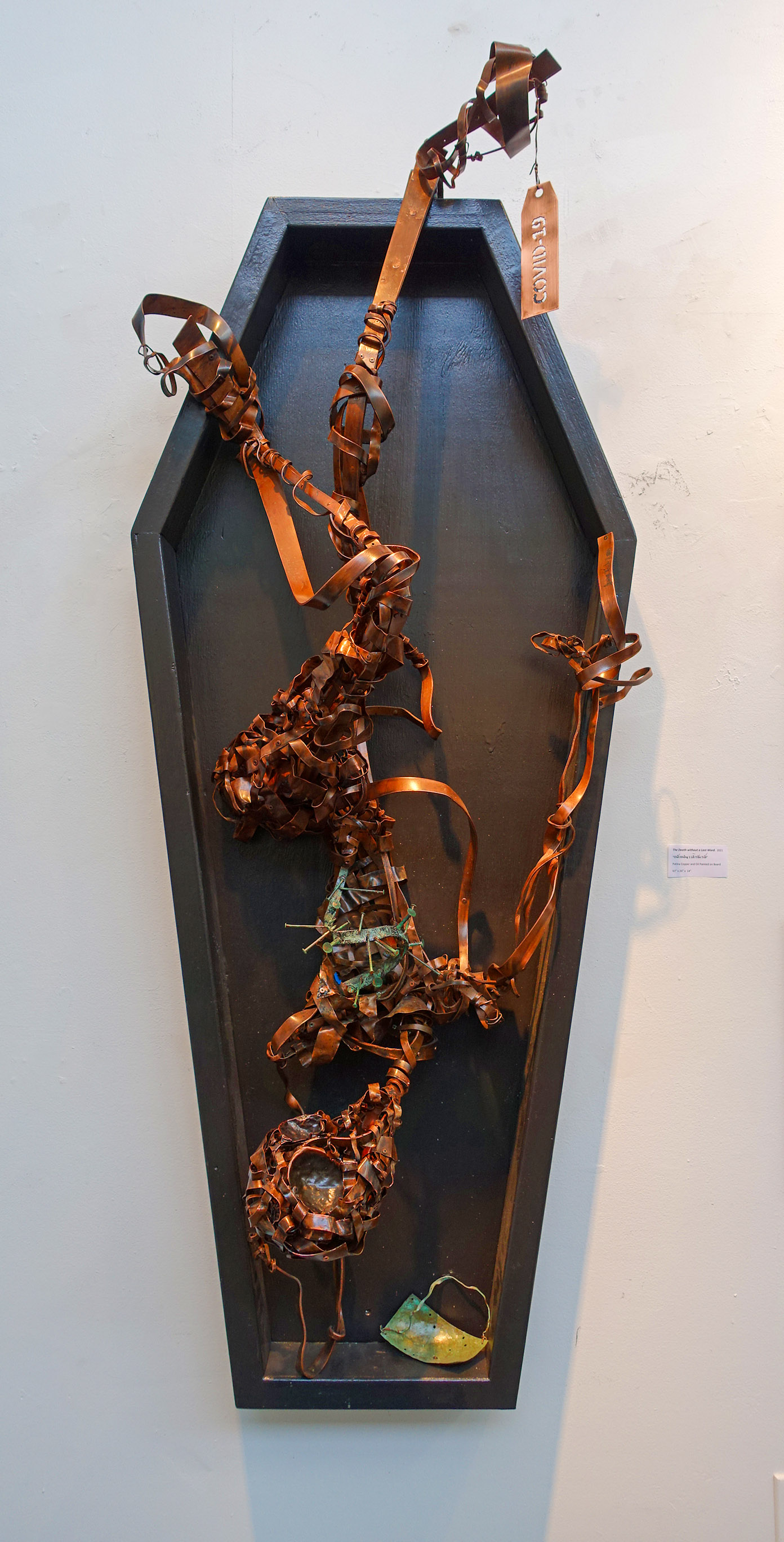 Henry Trịnh Nghiệp tham dự với 4 tác phẩm điêu khắc vừa Phù Điêu và Tượng Đứng. Một bức điêu khắc gây ấn tượng cho tôi nhất là bức "Chết không một lời trăn trối". Có hình tượng 1 chiếc quan tài với 1 bộ xương bằng dây kẽm màu đồng với tư thế nằm đảo ngược, phía dưới là 1 cái khẩu trang. Henry kể "Đó là hình ảnh người anh họ đã mất vì Covid, anh ấy nằm ngược mà còn ngoái đầu lên như muốn nói 1 lời trăn trối cuối cùng mà không nói được. Thời ấy, có khi người chết không biết tên tuổi là ai, họ chỉ để 1 cái nhãn là "Covid 19" mà thôi." Nhìn những chiếc đinh to tướng đóng vào bộ xương khiến tôi hình dung ra được sự đau đớn tột cùng của người chết.