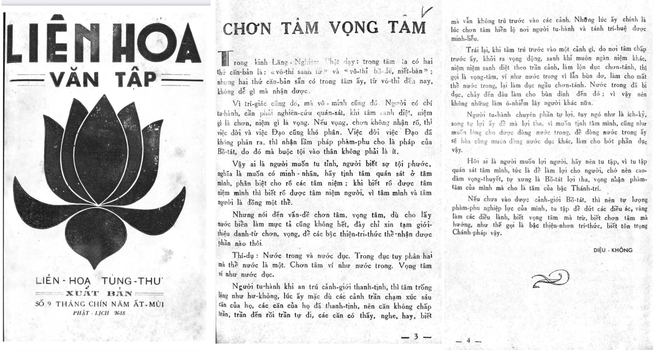Lời dịch giả: Bài viết "Chơn Tâm, Vọng Tâm" được Ni Trưởng Thích Nữ Diệu Không (1905-1997) viết, in trong Tạp chí Liên Hoa, số 9, tháng 9 năm Ất Mùi, tức là năm 1955. Tạp chí Liên Hoa thành lập năm 1955, với Thượng toạ Thích Đôn Hậu trú trì chùa Linh Mụ ở Huế làm chủ nhiệm, Thượng toạ Thích Đức Tâm làm chủ bút, và Ni sư Thích Nữ Diệu Không làm quản lý. Trong bài này, Ni sư ký tên tác giả là Diệu Không.