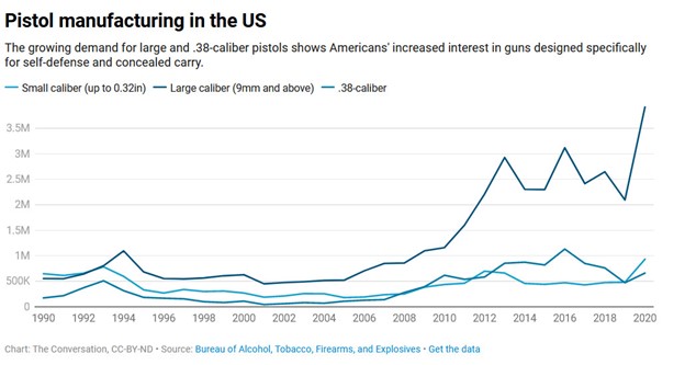 Số lượng súng lục cỡ lớn được sản xuất có thể bắn được những viên đạn lớn hơn hoặc bằng 9 mm đã tăng vọt trong 15 năm qua, tăng từ hơn 0.5 triệu khẩu năm 2005 lên hơn 3.9 triệu khẩu vào năm 2020. Số lượng súng ngắn cỡ nòng .38 - loại súng ngắn được thiết kế đặc biệt để có thể giấu kín khi mang theo - đã tăng lên mức kỷ lục 1.1 triệu vào năm 2016 và tổng cộng là 660,000 vào năm 2020, so với 107,000 vào năm 2005.