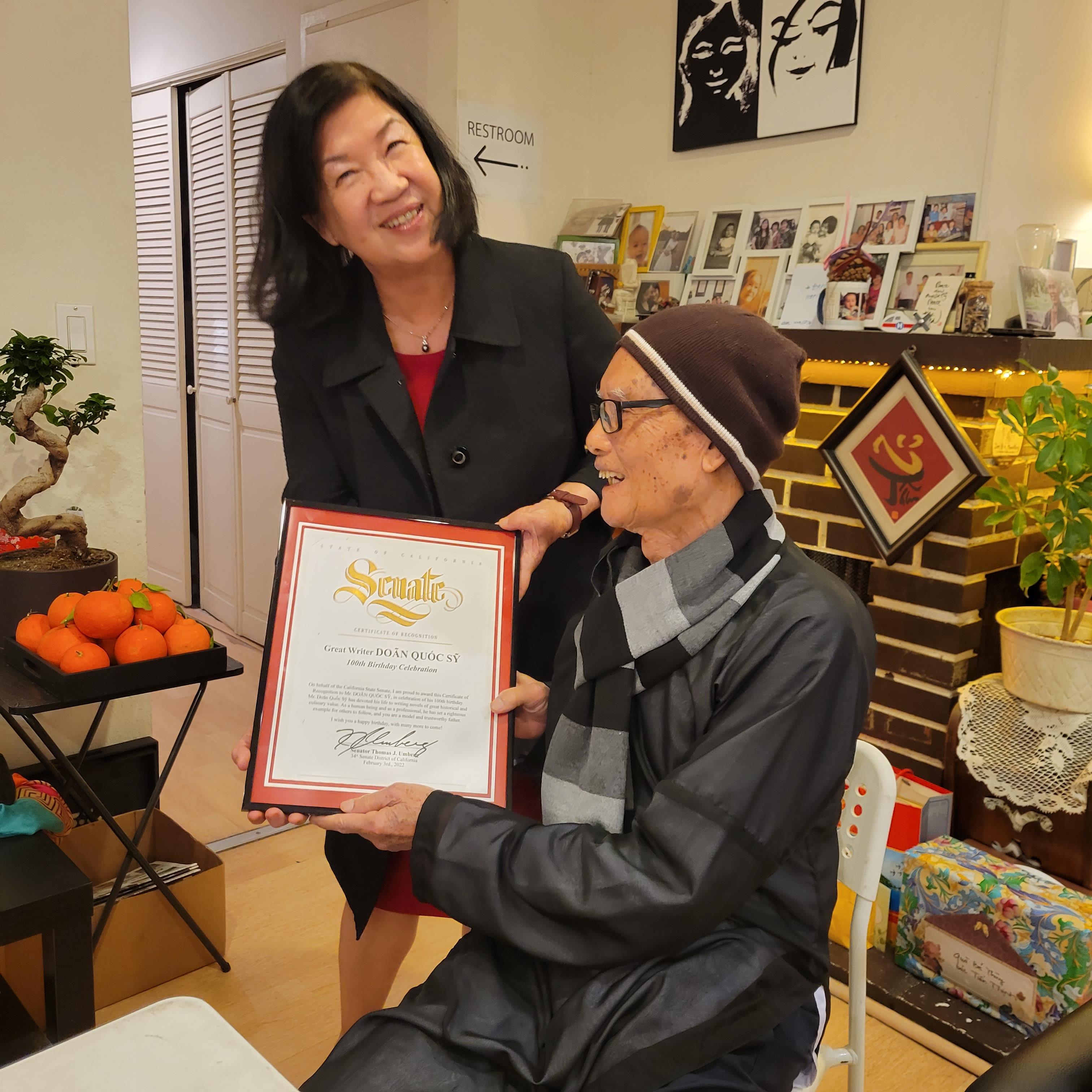 Trong bằng vinh danh, TNS Tom Umberg đã ghi: “đại diện cho Quốc Hội Tiểu Bang California, tôi hãnh diện được trao bằng tưởng lệ cho nhà văn Doãn Quốc Sỹ nhân ngày sinh nhật thứ 100. Ông đã cống hiến cả cuộc đời để viết những cuốn tiểu thuyết có giá trị lịch sử và văn hóa cao. Là một con người, một nhà giáo, ông đã xác lập một tấm gương về đạo đức cho các thế hệ sau noi theo. Ông cũng là một người cha mẫu mực và đáng kính”