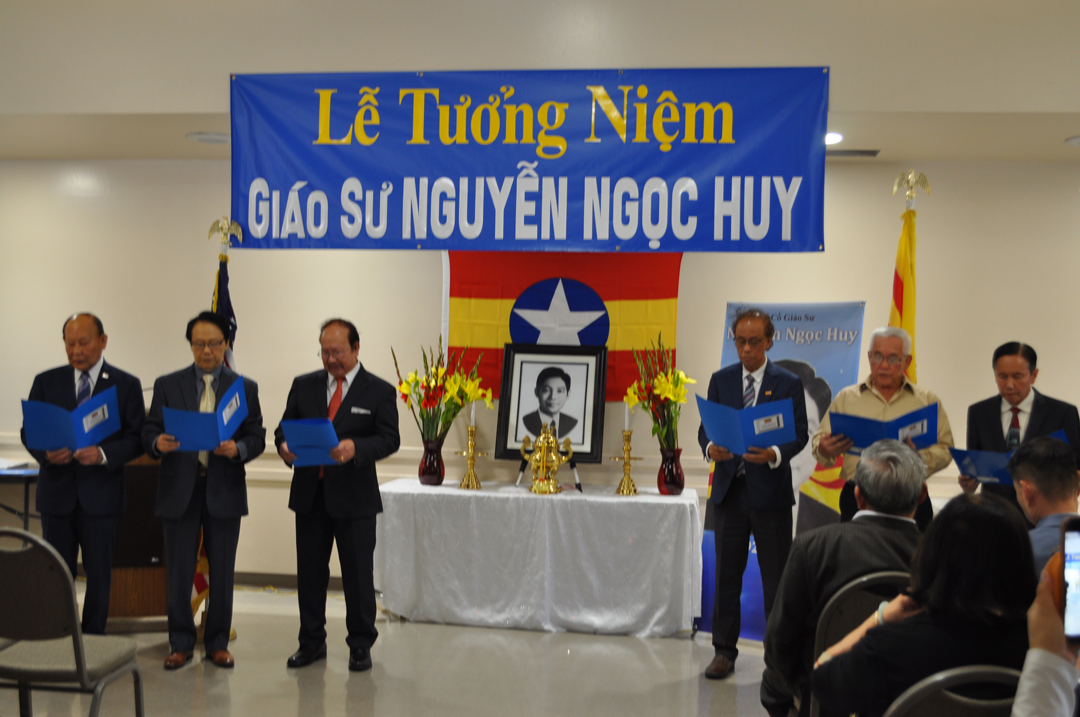 Điều hợp chương trình buổi lễ do MC: Mộng Thủy và Lê Văn, mở đầu MC Mộng Thủy cho biết lý do và thông qua chương trình. Sau đó nghi thức chào quốc kỳ Việt-Mỹ và phút mặc niệm. Sau phút mặc niệm các đồng chí Đảng Tân Đại Việt lên hợp ca bản “Việt Nam Minh Châu Trời Đông” và dâng hương tưởng niệm lên bàn thờ có chân dung cố Giáo Sư Nguyễn Ngọc Huy.