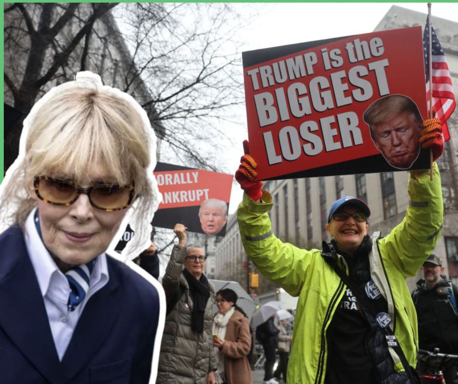 Ảnh nền: Người biểu tình hò reo khi Carroll đến tòa liên bang Manhattan ngày 25 tháng 1, 2024.  Photo by Spencer Platt/Getty Images