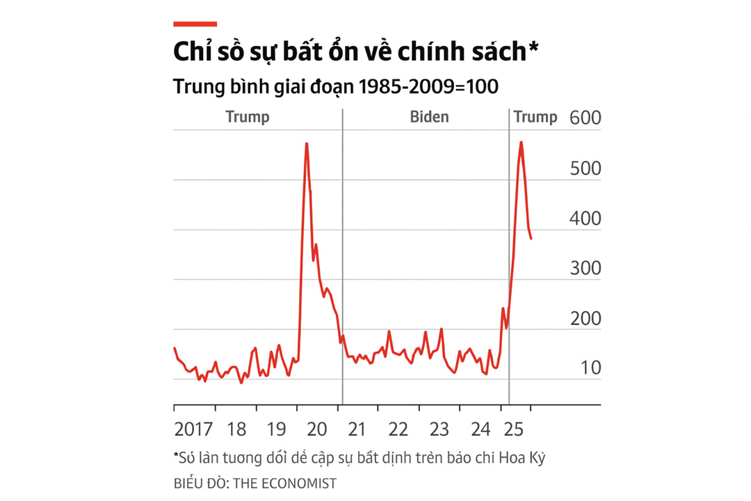 - Sự bất ổn về chính sách gia tăng: Chỉ số bất định kinh tế (EPU) – đo mức rối loạn chính sách qua truyền thông và giới phân tích – tăng vọt trở lại từ đầu năm. Khi viễn ảnh sáu tháng tới đã khó đoán, ít ai dám chi tiêu hay đầu tư dài hạn.