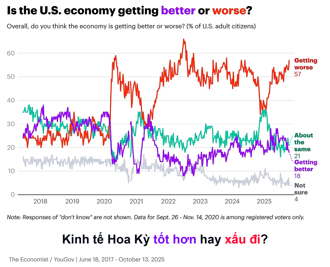 Theo một cuộc thăm dò dư luận vào tuần vừa qua của The Economist / YouGov, phần lớn người Mỹ hiện nay tin rằng tình hình kinh tế đang xấu đi, một chiều hướng trùng hợp với việc chính phủ đóng cửa, lo ngại về lạm phát và sự chia rẽ đảng phái ngày càng gia tăng. Sự bi quan như vậy sẽ ảnh hưởng đến niềm tin của người tiêu dùng, các quyết định chính sách và kết quả chính trị trước thềm cuộc bầu cử giữa nhiệm kỳ vào năm tới.