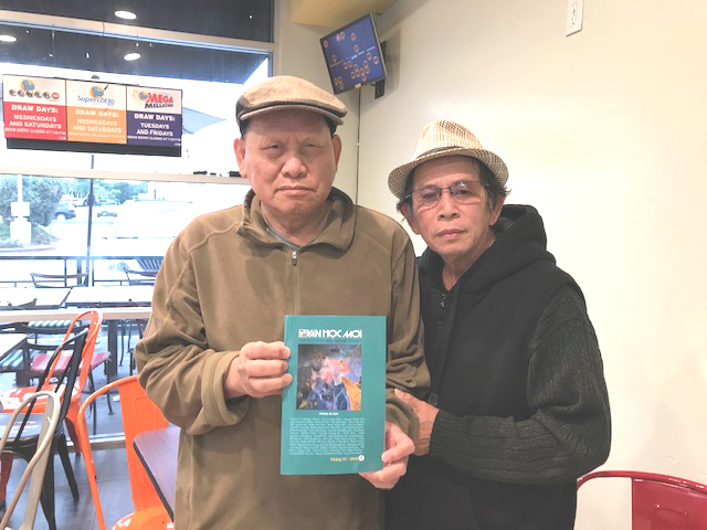 Từ trái: nhà văn Phan Tấn Hải và nhà thơ Hà Nguyên Du với ấn bản tháng 12/2019 của Tạp Chí Văn Học Mới