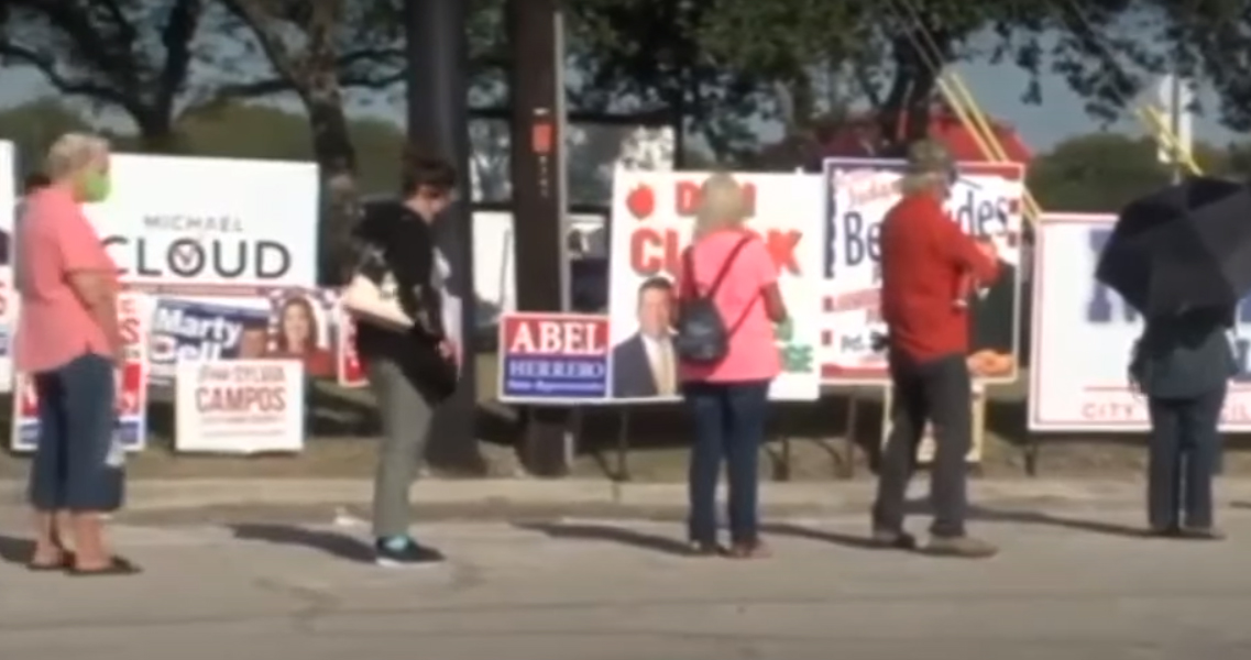 Hình ảnh sáng Thứ Ba 3/11/2020 cử tri đứng chờ vào phòng phiếu ở quận Nueces, Texas. Tiểu bang Texas chèn ép phiếu bầu, làm khó cử tri bằng nhiều cách, kể cả việc phiếu bầu sớm chỉ có một thùng nhận phiếu cho mỗi quận cho dù là có cả triệu dân trong quận.