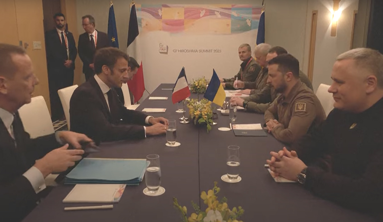 blankZelensky họp với Tổng Thống Pháp bên lề G7, trên bàn có lá cờ Pháp và Ukraine. Buổi họp đông người vì cần ban thông dịch.
