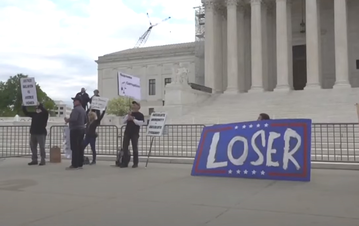 blankHình ảnh biểu tình trước Tòa Tối Cao. Sáng nay, Thứ Năm, Tòa Tối Cao nghe biện luận rằng Trump có quyền miễn tố tuyệt đối hay không.