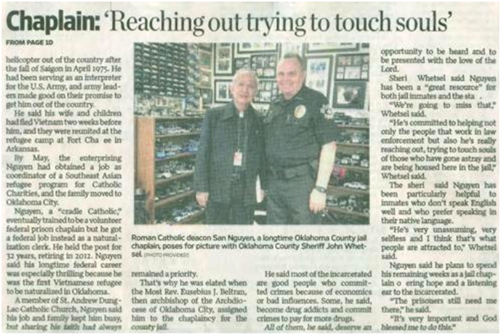Thời gian thấm thoát trôi mau như một cơn gió thoảng, vì mới ngày nào đây tôi lãnh nhận nhiệm vụ là một Tuyên Úy Trại Tù (Prison Chaplain), do Đức Tổng Giám Mục Công Giáo Oklahoma City Eusebius J. Beltran chỉ định tôi và kể từ ngày đó đến nay, tôi đã được phục vụ Anh Chị Em tù nhân, không phân biệt sắc tộc, tôn giáo, màu da, liên tục hơn 20 năm qua và trong công tác Mục Vụ Tông Đồ Trại Tù này đã được thi hành một cách tốt đẹp, là nhờ một phần tình nguyện, góp công góp sức, tận tình chung vai sát cánh với tôi trong nhiều năm qua của ông Nguyễn Văn Cường, cựu Phó Tỉnh Trưởng Hành Chánh Tỉnh Lâm Đồng, thời chính thể Việt Nam Cộng Hòa, trong nhiệm vụ là Thừa Tác Viên Trại Tù (Prison Minister), cũng do Đức Tổng Giám Mục Công Giáo Beltran chỉ định ông.