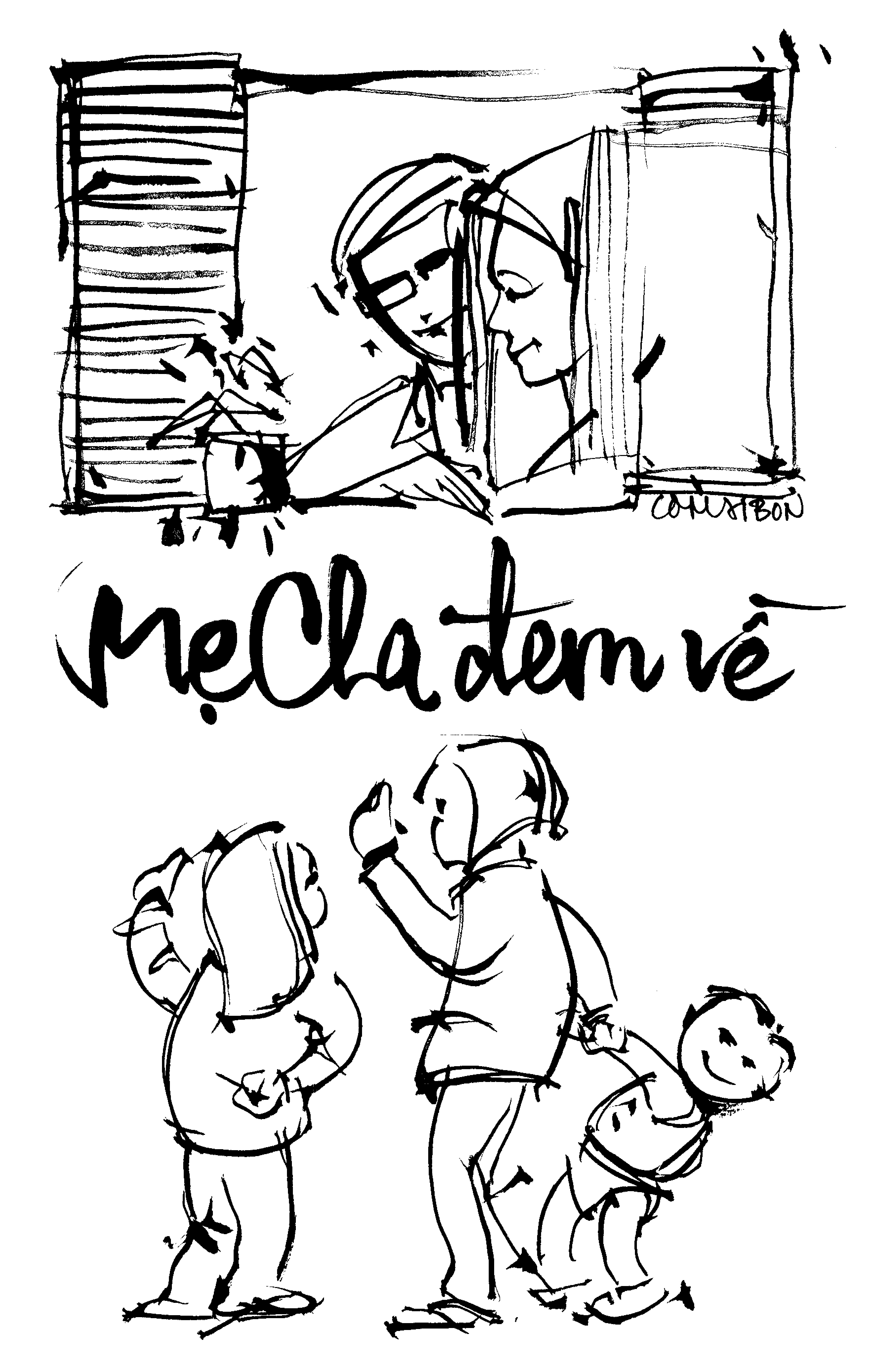 Hôm nay đón Mạ ở bệnh viện về. Mạ bị té nứt xương chậu, phải giải phẫu. Mạ còn phải dùng nạng một thời gian nữa, song song với việc tập thể dục. Ở nhà rộn ràng. Đám con nít vẽ tranh trang trí mừng bà Ngoại bình phục. Nhà bếp dao thớt nhịp nhàng, đủ các món sơn hào hải vị. Ai nấy đã vào bàn. Ba hỏi: