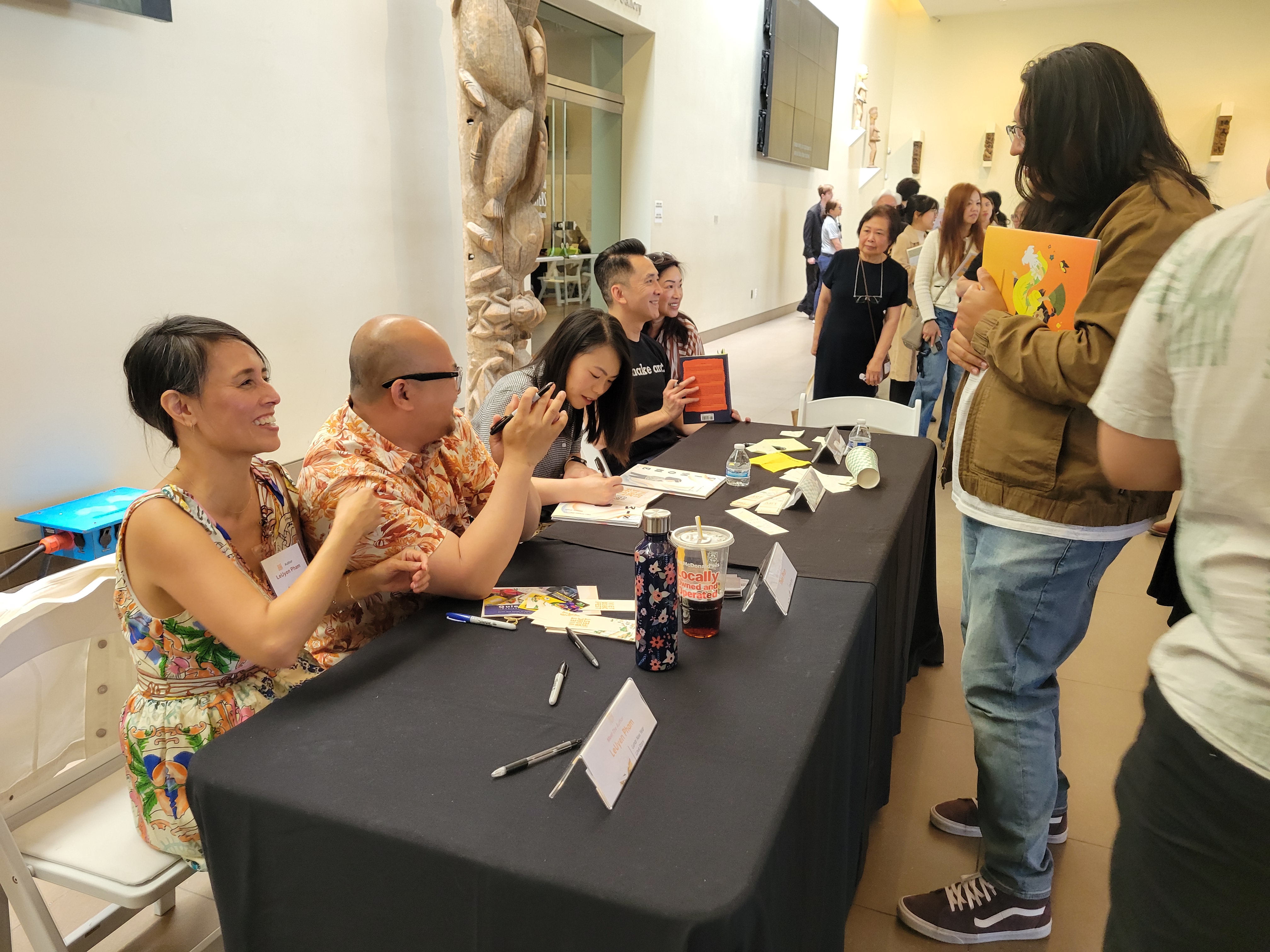 Viet Book Fest 2024 có ba buổi hội luận. “Định Hình Cộng Đồng: Tiểu Thuyết Truyện Tranh và Truyện Tranh Thiếu Nhi” là chủ đề của cuộc hội luận đầu tiên. Bốn tác giả truyện tranh LeUyen Phạm, Thiện Phạm, Việt Thanh Nguyễn, và Minnie Phan trình bày về những tác phẩm của mình, cũng như chia sẻ những mẫu chuyện vui buồn của nghiệp cầm cọ-cầm viết, qua sự điều hợp của Giáo Sư Thúy Võ-Đặng. Gây ngạc nhiên nhất có lẽ sự góp mặt của Nguyễn Thanh Việt, tác giả của cuốn tiểu thuyết trinh thám đoạt giải Pulitzer “The Sympathizer”. Ông giải thích lý do trở thành người viết truyện tranh thiếu nhi: vì cô con gái yêu của mình. Cuốn truyện tranh tựa đề “Simone” mà ông giới thiệu cũng là tên của cô bé, ngồi trên lòng bố hầu như trong suốt cuộc hội thảo. Cô còn sốt ruột hỏi bố chừng nào thì cô được ký tặng sách cho bạn của mình. “Simone” được họa sĩ Minnie Phan minh họa, được xuất bản trong tháng 5, kể về cô bé Simone có cuộc sống bất ngờ bị đảo lộn bởi một vụ cháy rừng. Tác giả LeUyen Phạm giới thiệu cuốn truyện tranh mang tựa đề “Lunar New Year Love Story” (Chuyện Tình Ngày Tết Nguyên Đán). Tác giả Thiện Phạm trình bày về tác phẩm “Family Style: Memories of an American from Vietnam” (Cơm Gia Đình: Ký Ức Của Một Người Mỹ Từ Việt Nam), cuốn truyện tranh phản ánh sự quan trọng của ẩm thực trong hành trình tìm kiếm “Giấc Mơ Mỹ” của một gia đình Việt.
