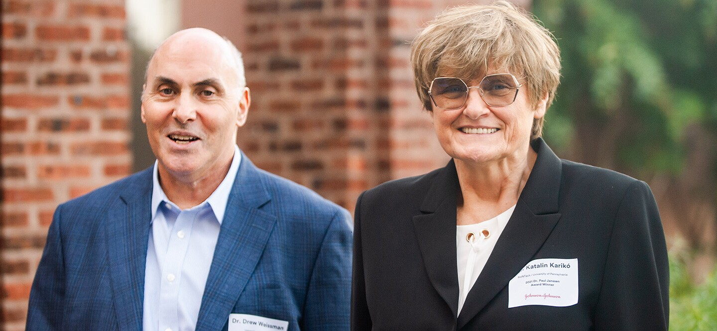 Hội đồng Nobel tại Viện Karolinska đã công bố Katalin Kariko và Drew Weissman là những người đoạt giải Nobel Sinh lý học và Y học (Nobel Prize in Physiology and Medicine) năm 2023 vì những khám phá của họ đã giúp phát triển vaccine mRNA hiệu quả chống lại Covid-19. Hình trên, từ trái: Drew Weissman, Katalin Kariko. (Photo: Johnson & Johnson)