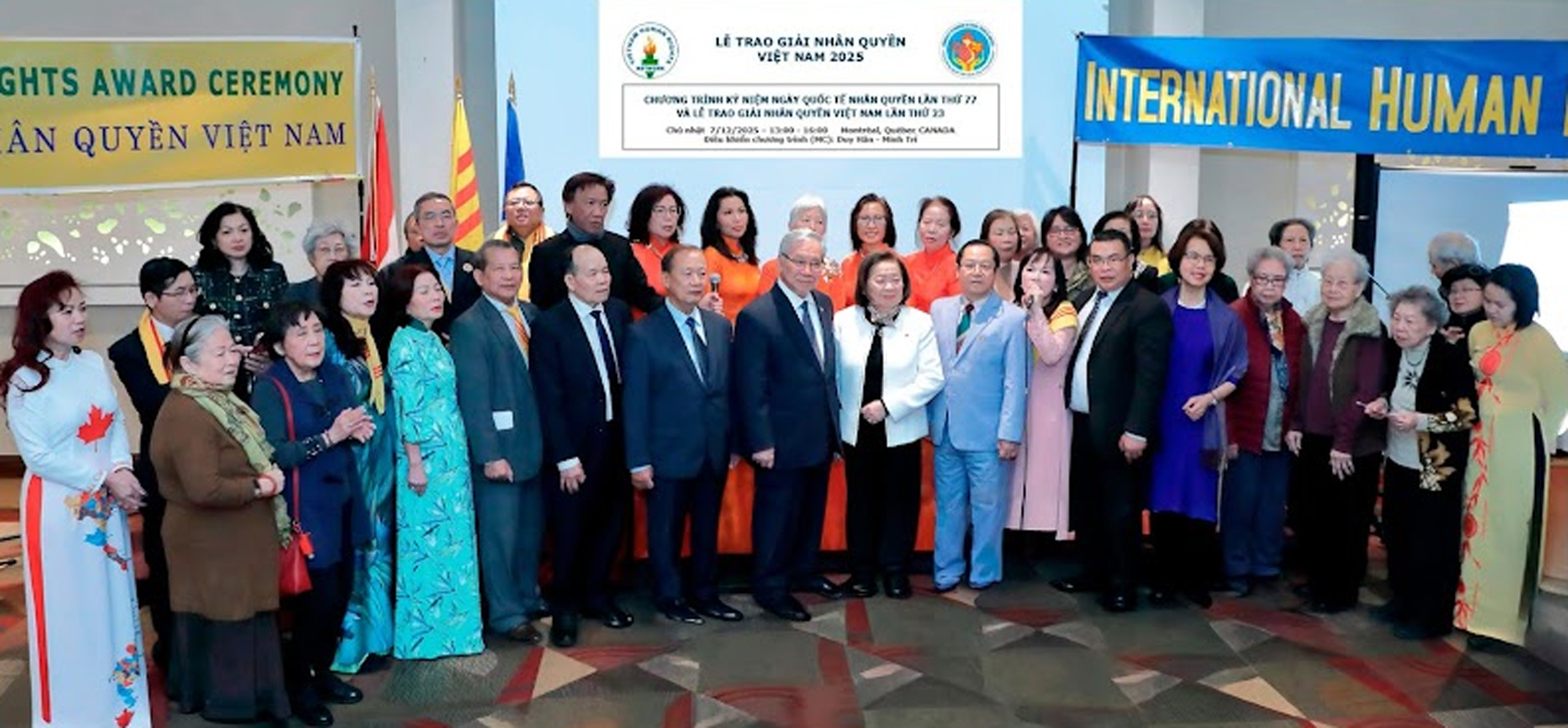 Montréal, Canada, 7-12-2025 --  Ngày Quốc Tế Nhân Quyền lần thứ 77 và Lễ Trao Giải Nhân Quyền Việt Nam 2025 đã được long trọng tổ chức tại sảnh đường Singapore của khách sạn Ruby Foo’s vào lúc 1 giờ chiều ngày 27-12-2025 do sự phối hợp giữa Mạng lưới Nhân quyền Việt Nam với Cộng đồng Người Việt Quốc gia vùng Montréal và sự hỗ trợ của một số đoàn thể của người Việt tỵ nạn nhiều nơi trên thế giới.