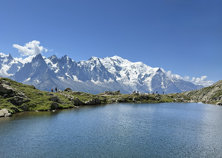 Chúng tôi tìm được chỗ bên hồ để ăn trưa và ngắm cảnh.  Trời vẫn trong xanh với một vài đám mây trắng nhẹ thênh.  Gió hiu hiu làm mặt nước hồ lăn tăn gợn sóng.  Cũng vì thế mà phản ảnh của rặng Mont Blanc dưới nước không rõ như trong những hình tôi đã thấy trên mạng.