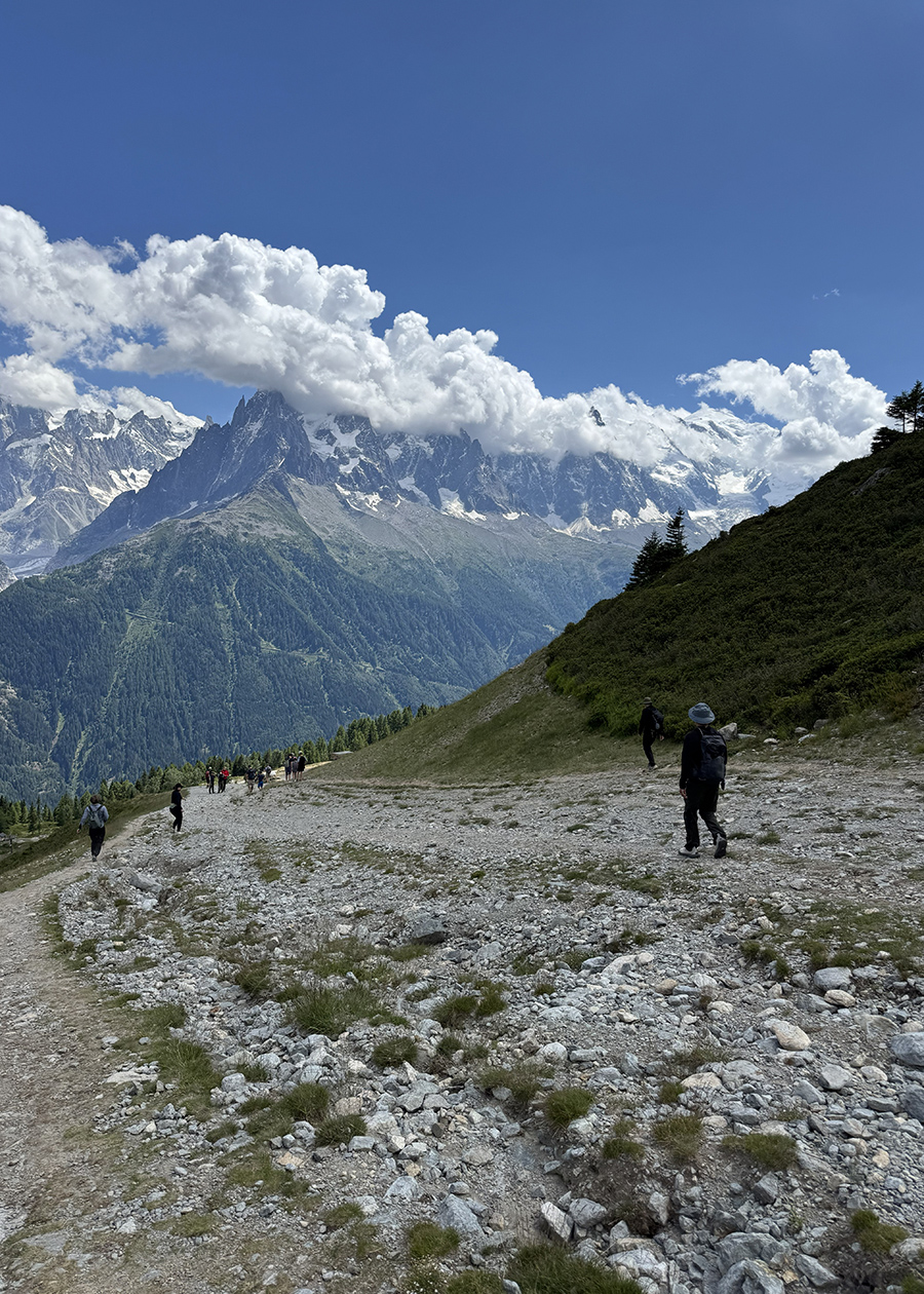 Sau khi làm quen với vị trí của những đỉnh núi chính trên lộ trình sắp tới, chúng tôi đáp xe cable xuống chặng lưng chừng núi, Plan de l’Aiguille, để bắt đầu chuyến hiking trên Grand Balcon Nord dưới một bầu trời xanh vương vất mấy cụm mây.  Lối mòn dắt chúng tôi đi vòng vèo một khúc ngắn, rồi bất chợt bẻ quặt sang trái.  Đứng sát mép ghềnh đá, khung cảnh núi non bỗng trải rộng và gần ngay trước mắt như một màn ảnh đại vĩ tuyến.