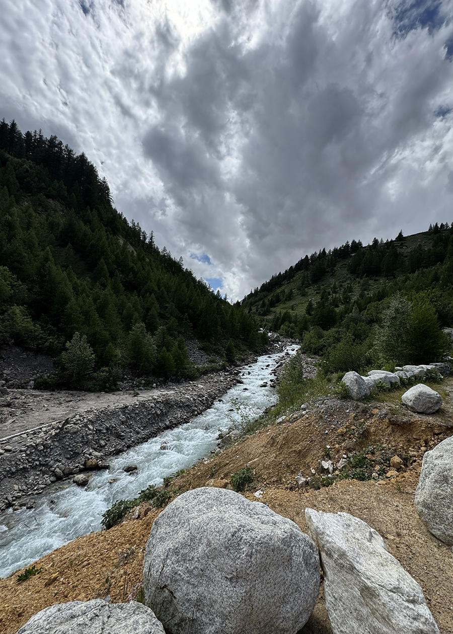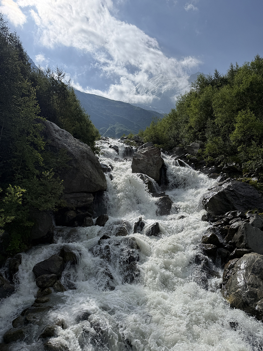 Giữa cánh rừng, lối mòn đổ xuống với những tảng đá lớn khiến chúng tôi phải chậm bước.  Tiếng gầm của nước chảy mạnh càng lúc càng lớn, vọng lại từ lũng sâu.  Vài phút sau, một con suối khá lớn hiện ra; dòng glacial torrent từ Bonnassay Glacier hung hăng đập vào trăm phiến đá tảng, tung tóe bọt trắng xóa.  Cây cầu treo dài bắt ngang, lắc lư theo từng bước chân.  Tôi thấy hào hứng như chính mình đang mạo hiểm trong một phim của Indiana Jones.  Nhịp cầu nhún nhảy lắc qua lắc lại làm tôi đi như người say rượu.  Qua khỏi cầu thì lại bắt đầu leo núi.  Những tảng đá lớn đầy rêu trơn trợt.  Leo trèo bắt toát mồ hôi.  Mệt quá nên phải kiếm chỗ nghỉ.  Khổ nỗi lúc ấy chúng tôi đang ở đoạn đường không còn bóng mát vì đã ra khỏi rừng.  Cả bọn đành chồm hổm bên đường nghỉ chân.  Nhưng nhờ vậy mà tôi mới khám phá ra là cái vị thế ngồi rất An-Nam đó lại làm cho một số cơ bắp được kéo giãn bớt căng.