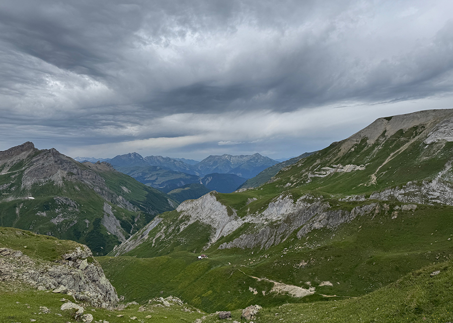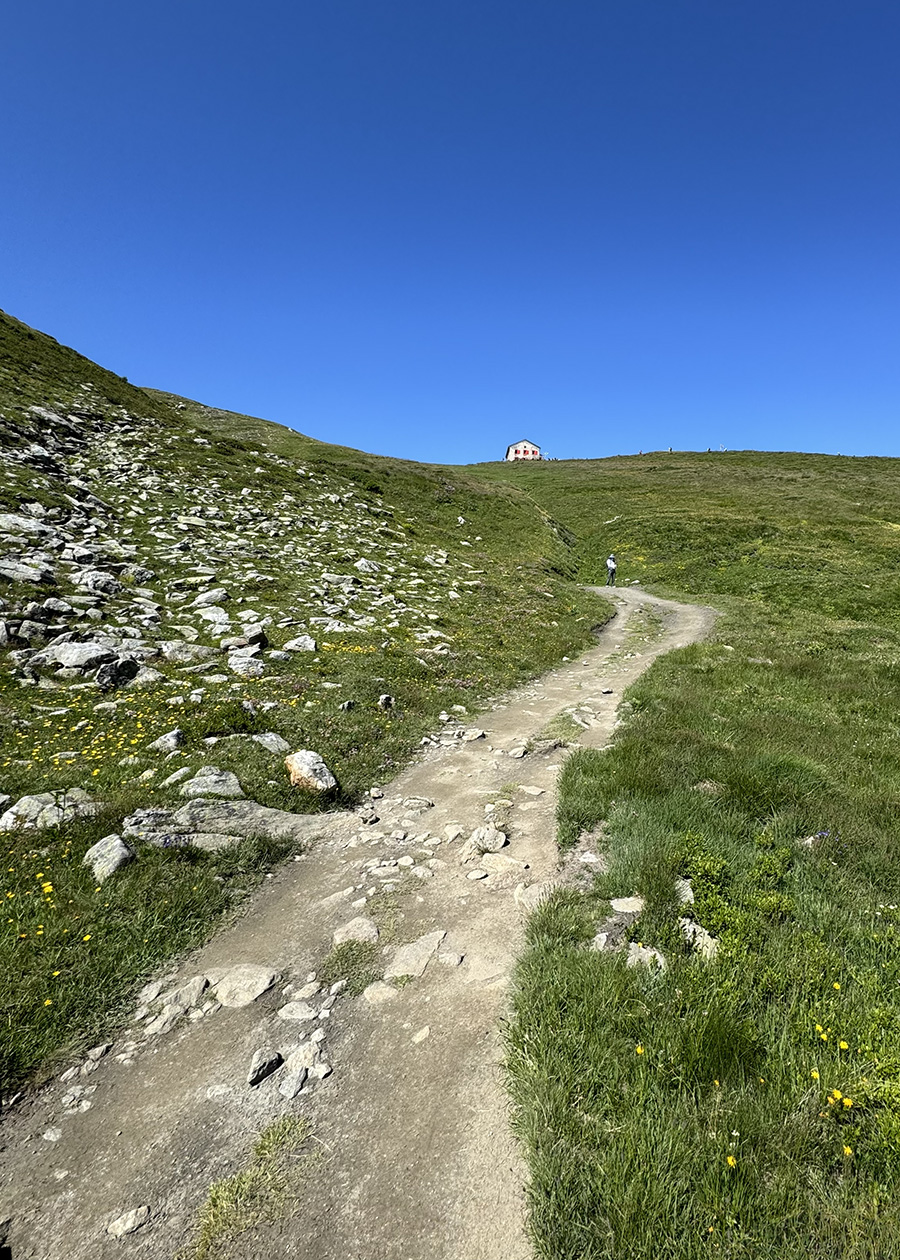 Xa xa tít trên đầu dốc là một căn nhà nhỏ, nằm chơ vơ một mình trông như một điểm son giữa bao la những cánh đồng và đồi núi. Đèo Col de Balme ở trên đó.