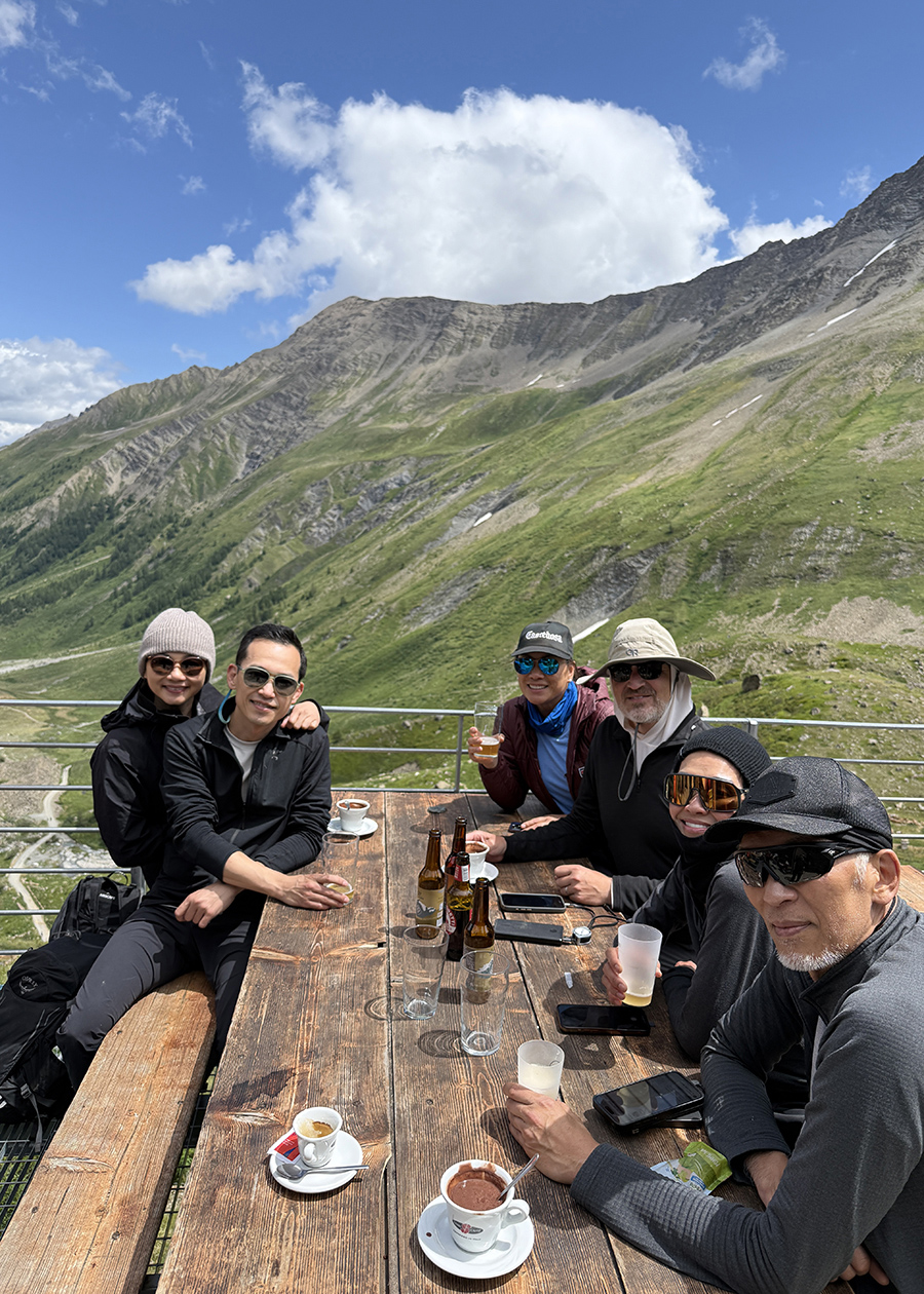 Tuy vậy, ngồi gặm bánh mì, uống rượu rosé và ngắm cảnh nước non hùng vĩ thật là một trải nghiệm khó quên trong đời.  Tôi nhớ đến câu nói nổi tiếng trong đám đi hiking của nhà văn Antoine de Sait-Exupéry trong cuốn Wing, Sand and Stars, Kẻ leo núi sẽ mang theo về một phần nào của núi đồi, và đồng thời cũng để lại trên đó một phần của chính họ (A man does not climb a mountain without bringing some of it away with him, and leaving something of himself upon it.)