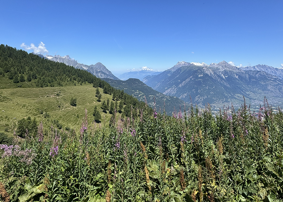 Sau bữa trưa, chúng tôi lại vác bao bị lên lưng đi tiếp.  Ra khỏi nông trại Bovine, đường mòn ôm quanh sườn đồi thoai thoải về hướng Col de la Forclaz.  Đến một khúc quanh, Eric chỉ chúng tôi nhìn xuống: thung lũng Rhône trải dài, với thị trấn Martigny như một mảng đất đá nâu lổm chổm.  Từ trên cao đứng sát mép bờ đá, tôi cảm thấy mình thật nhỏ bé mỏng manh gần như có thể bay bổng rất tự do.  Icarus.  Icarus đã bay bổng như vậy và đã rơi xuống biển sâu.