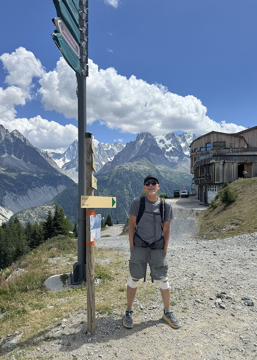Hôm nay mới thực sự bắt đầu chuyến đi vòng quanh dưới rặng Mont Blanc.  Chặng thứ nhất: từ Chamonix đến Les Houches, một thành phố cách đây 16km (9.94mi).  Chuyến du hành ngàn dặm vẫn luôn bắt đầu bằng một bước đi, Lão Tử đã nói như vậy trong Đạo Đức Kinh.  Và những bước đầu tiên là leo một con dốc thẳng đứng ngay sau lưng hotel, leo bắt mệt bở hơi tai.  Hết con dốc, rẽ sang trái là con đường dẫn vào Petit Balcon Sud, nằm ôm lấy sườn núi trong rặng Aiguilles Rouges.  Dân đi núi thường dùng chữ balcon để chỉ những quãng đường họ cho là khá bằng phẳng.  Tuy nói vậy chứ vẫn có rất nhiều đoạn leo dốc thật ác liệt, chỉ có tương đối ngắn hơn mà thôi.