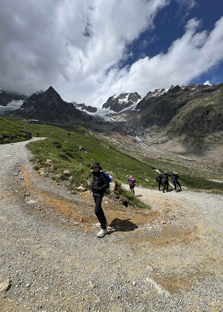 Sáng Chamonix vẫn còn trong trẻo.  Trời xanh biếc.  Nắng thật nhẹ.  Thị trấn từ từ lùi lại phía dưới; tiếng động của phố thị nhạt dần, nhường chỗ cho tiếng sỏi lạo xạo và nhánh cây khô vỡ dòn dưới gót giày, tiếng chim ríu rít buổi sớm mai.  Quãng đường này rợp bóng mát vì có thật nhiều cây cao, có gốc đến cả hai ba người ôm.  Đi ngang một vài nơi trống cây vì đất sụp, khung cảnh mở ra cho chúng tôi được ngắm nhìn cả rặng Mont Blanc bên kia thung lũng, cùng những mảng băng tảng glacier lấp lánh trong nắng.  Đây là mớ băng còn sót lại.  Những nhà khoa học tiên đoán rằng nếu khí hậu vẫn tiếp tục biến đổi thì đến cuối thế kỷ này sẽ chẳng còn băng tuyết trên rặng Mont Blanc nữa.