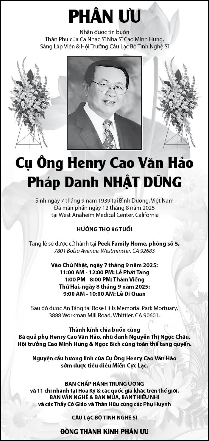 Phân Ưu: Nhận được tin buồn Ông NGUYỄN NGỌC TUYỀN, Pháp Danh QUANG MINH, sinh ngày 02 tháng 02, năm1932 tại Làng Hoành Lộ, huyện Giao Thủy, Tỉnh Nam Định, Bắc phần Việt Nam đã mệnh chung ngày 17 tháng 6, năm 2025, tai Santa Ana, California. Hưởng thọ 94 tuổi.