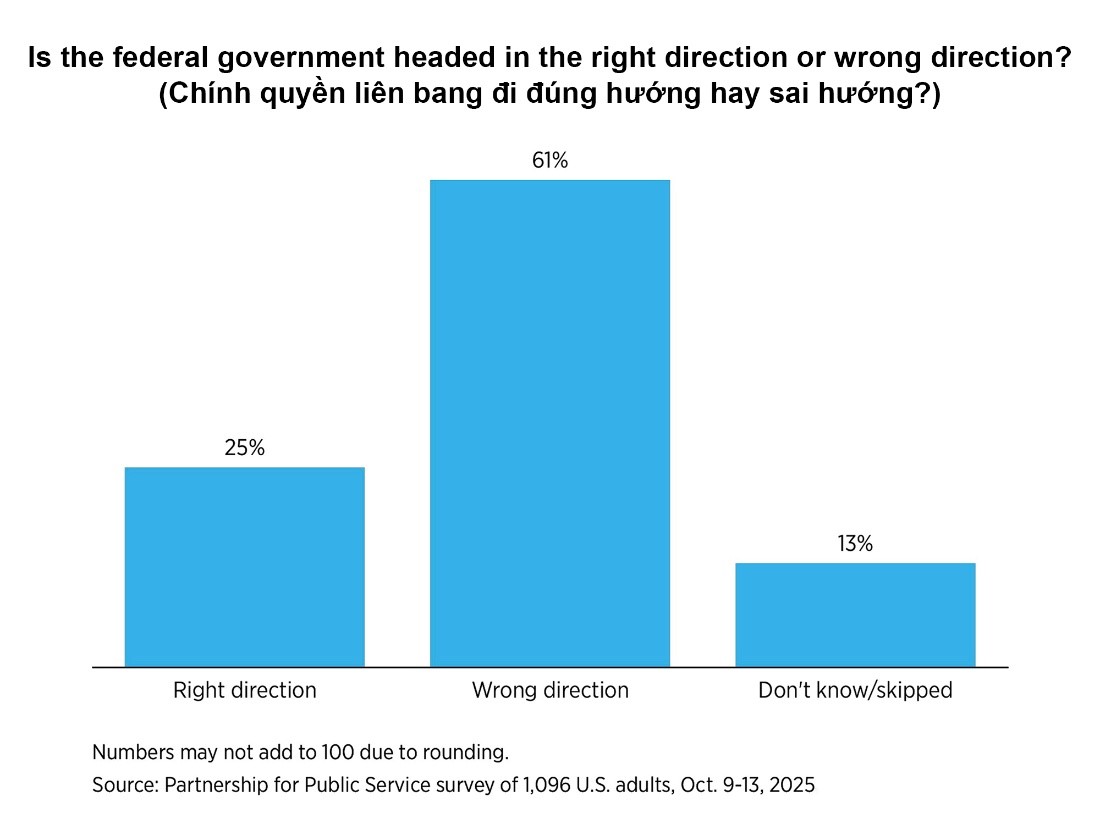 Một cuộc khảo sát mới do Partnership for Public Service thực hiện vào tháng 10, 2025 trong thời gian chính phủ đóng cửa cho thấy phần lớn công chúng bi quan về cách quản lý của chính phủ liên bang và rằng việc cắt giảm nhân sự và các chương trình của chính phủ liên bang dưới thời chính quyền Trump đang gây tác động tiêu cực đến đất nước. Có tới 61% người dân cho rằng chính phủ đang đi sai hướng, trong khi chỉ có 25% cho rằng chính phủ đang đi đúng hướng. 13% còn lại không chắc chắn.
