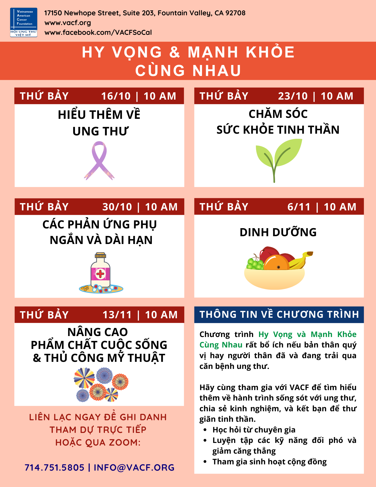 Buổi sinh hoạt kế tiếp trong chương trình "Hy Vọng và Mạnh Khỏe Cùng Nhau" dành cho bệnh nhân ung thư và người chăm sóc thân nhân bị ung thư do Hội Ung Thư Việt Mỹ tổ chức sẽ bắt đầu vào Thứ Bảy, ngày 16 tháng 10 năm 2021, từ 10 giờ sáng đến 12 giờ trưa (theo giờ Cali). Để ghi danh tham gia, xin vui lòng liên lạc Hội Ung Thư Việt Mỹ (Vietnamese America Cancer Foundation - VACF) bằng cách gọi 714.751.5805 (nhân viên nói tiếng Việt), hoặc gửi email đến [email protected], hoặc bấm vào đường dẫn https://tinyurl.com/HWT1016.