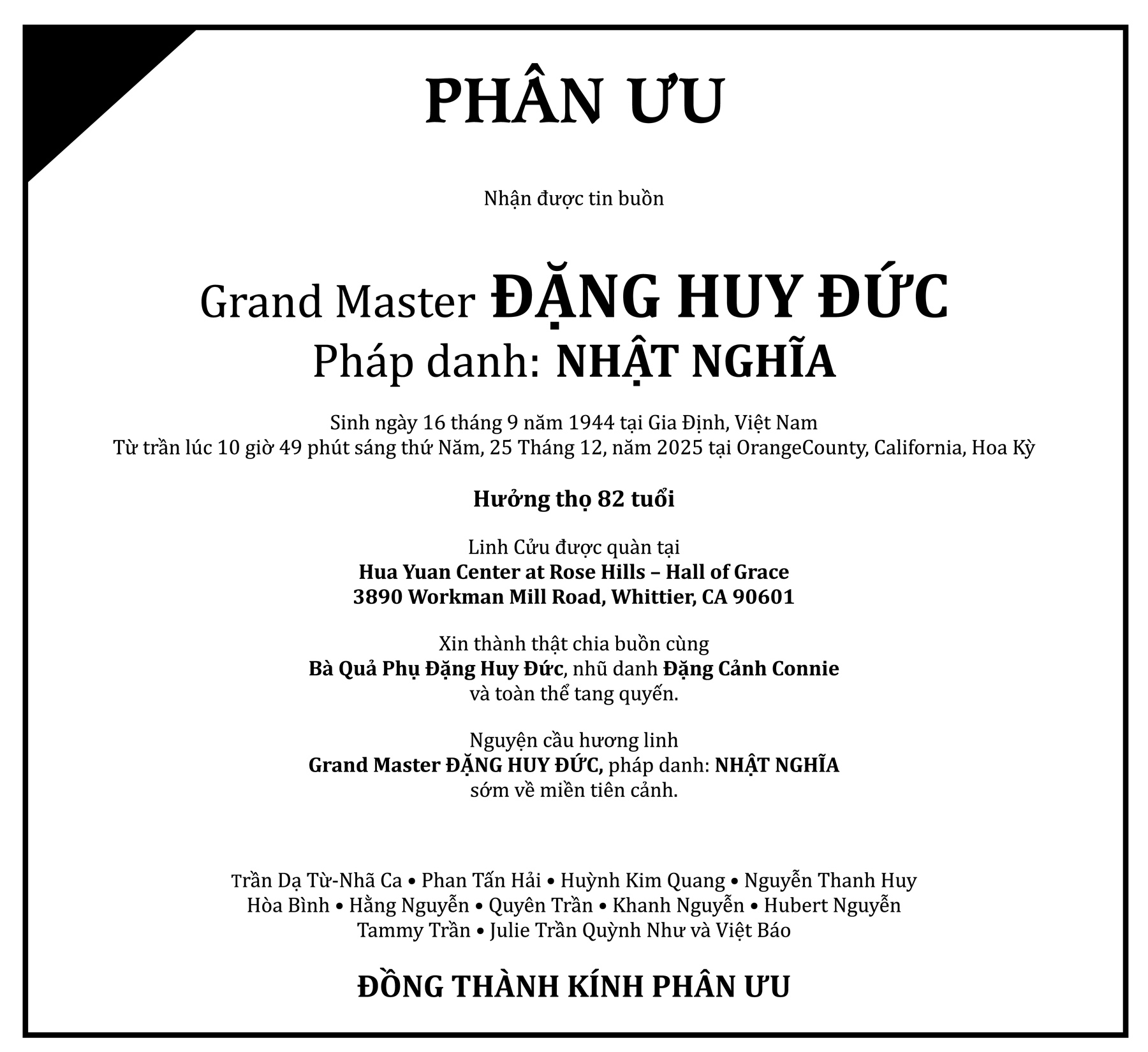 Bà Phạm Tấn Danh * Nhũ danh HÀ THỊ NHƯ HOA * Pháp Danh TỊNH HUÊ * Sinh ngày 12/07/1933 tại Việt Nam * Vãng sanh ngày 03/12/2025 tại Melbourne, Australia * Hưởng Đại Thọ 93 tuổi. * Toàn thể cấp chỉ huy, nhân viên, cán bộ Bộ Dân Vận Chiêu Hồi Việt Nam Cộng Hoà