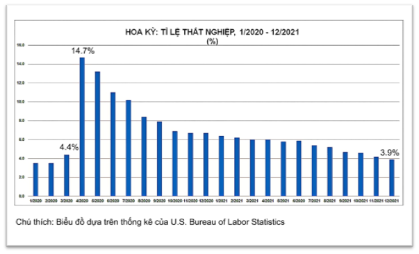 Trung bình mỗi tháng trong 2021 nền kinh tế đã tạo thêm 537,000 việc làm. Riêng trong tháng 12/2021 số việc làm tăng 651,000 so với một tháng trước. Nói tổng quát, số việc làm gia tăng trung bình là 4.5% trong năm 2021, nhiều nhất kể từ 1978.  Theo USBLS, trong tháng 11, 2021, hơn 4.5 triệu người tình nguyện bỏ việc làm, so với con số của tháng 10, 2021 là 4.2 triệu. Đây là một con số cao nhất trong hai thập niên vừa qua. Điều này cho thấy là nhu cầu cần người làm khá cao, nên công nhân lợi dụng cơ hội này để tìm việc tốt hơn.