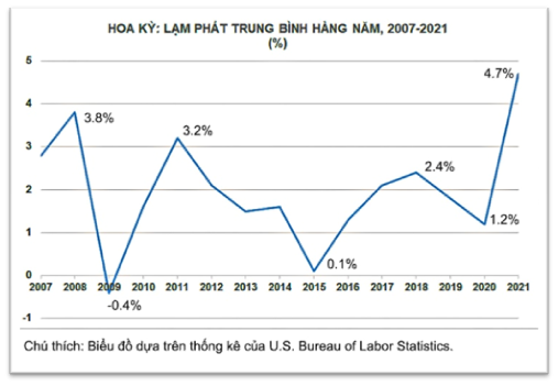 Sau thời kỳ trì trệ hay bị xáo trộn, khi bước sang giai đoạn bành trướng trở lại thông thường kinh tế phải chịu đựng một thời gian lạm phát, it hay nhiều.  Hoa Kỳ vừa bước vào giai đoạn phát triển mới. Theo thống kê của Bộ Lao Động Hoa Kỳ, tỉ lệ lạm phát của tháng 12, 2021 dựa trên chỉ số tiêu thụ (consumer price index – CPI) là 7%.  Đây là một con số cao nhất trong 39 năm qua kể từ 1982 một phần vì là mùa lễ. Giá xăng (gasoline) tăng nhiều nhất 49.6%. Tiếp theo là nhiên liệu (fuel) 38%, chuyên chở 21.1%, điện 10.4%, thực phẩm 6%, quần áo 5.8% và nhà 5.1%. Tính trung bình cho cả năm 2021, tỉ lệ lạm phát là 4.7%, cao nhất kể từ 1990 so với mục tiêu “lạm phát lý tưởng” của Federal Reserve là 2%.
