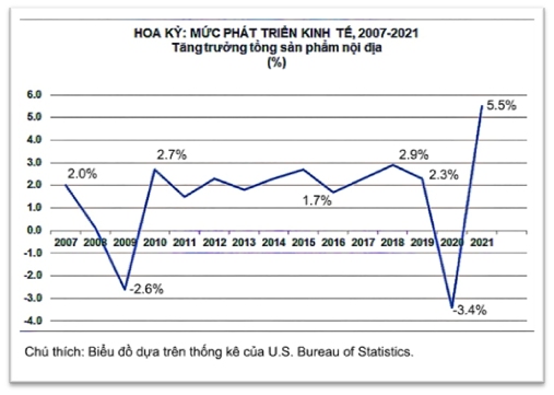 Việc đầu tiên để định giá một nền kinh tế là xem tổng sản lượng nội địa (gross domestic product – GDP) tăng trưởng ra sao.  Sau cuộc đại trì trệ kinh tế (great recession) 2008-2009, kinh tế Hoa Kỳ đã trải qua một giai đoạn phát triển lâu dài nhất trong 128 tháng từ 6/2009 - 2/2020, rồi bất ngờ chấm dứt vì đại dịch COVID-19.  Giai đoạn phát triển hiện nay bắt đầu từ 6/2020, kéo dài được 20 tháng. Từ mức co cụm kinh tế -3.4% vào năm 2020, chính quyền Biden đã thành công trong việc làm kinh tế phát triển mạnh trở lại vào 2021 ở mức độ khả quan như sau: Q1: 6.3%, Q2: 6.7%, Q3: 2.1 % và Q4: 6.3% (ước tính).