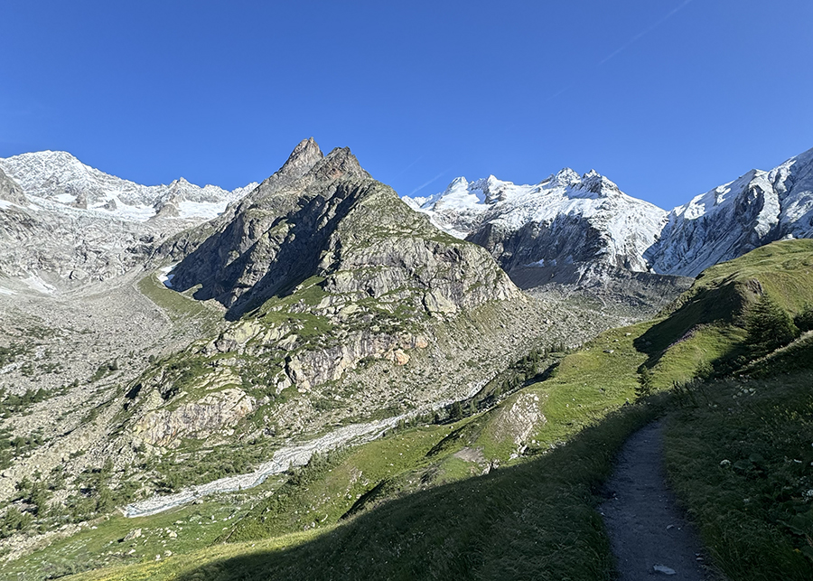 Sáng Chamonix vẫn còn trong trẻo.  Trời xanh biếc.  Nắng thật nhẹ.  Thị trấn từ từ lùi lại phía dưới; tiếng động của phố thị nhạt dần, nhường chỗ cho tiếng sỏi lạo xạo và nhánh cây khô vỡ dòn dưới gót giày, tiếng chim ríu rít buổi sớm mai.  Quãng đường này rợp bóng mát vì có thật nhiều cây cao, có gốc đến cả hai ba người ôm.  Đi ngang một vài nơi trống cây vì đất sụp, khung cảnh mở ra cho chúng tôi được ngắm nhìn cả rặng Mont Blanc bên kia thung lũng, cùng những mảng băng tảng glacier lấp lánh trong nắng.  Đây là mớ băng còn sót lại.  Những nhà khoa học tiên đoán rằng nếu khí hậu vẫn tiếp tục biến đổi thì đến cuối thế kỷ này sẽ chẳng còn băng tuyết trên rặng Mont Blanc nữa.