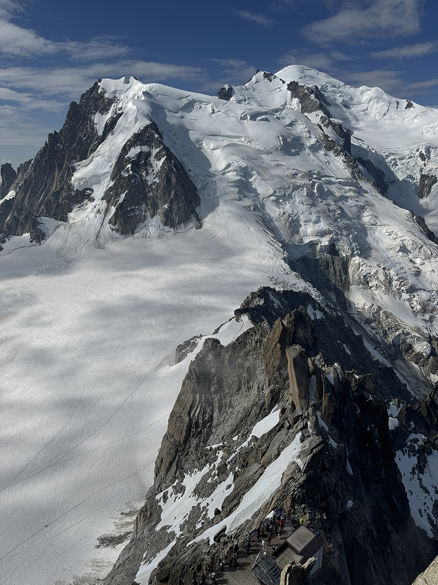 Aiguille cao 3.842m (12,605ft) phải trang bị đến hai chặng xe cable mới đủ đưa du khách lên tận đỉnh.  Tôi đứng trên sàn quan sát Terrasse d’observation, gió lạnh cắt da thổi luồn qua mấy lớp áo như muốn tập cho tôi quen với thời tiết nơi này.  Không gian chung quanh đài sâu thẳm và mênh mông, vương vất vài dãi mây khói len lỏi giữa những ngọn núi mà trong vài ngày kế tiếp chúng tôi sẽ đi ngang; chúng xếp hàng trùng điệp hai bên ngọn Mont Blanc tuyết phủ trắng xóa.  Dưới ánh nắng buổi sáng, khối băng khổng lồ ấy trông uy nghi, trầm lặng, như ấp ủ nhiều bí mật.