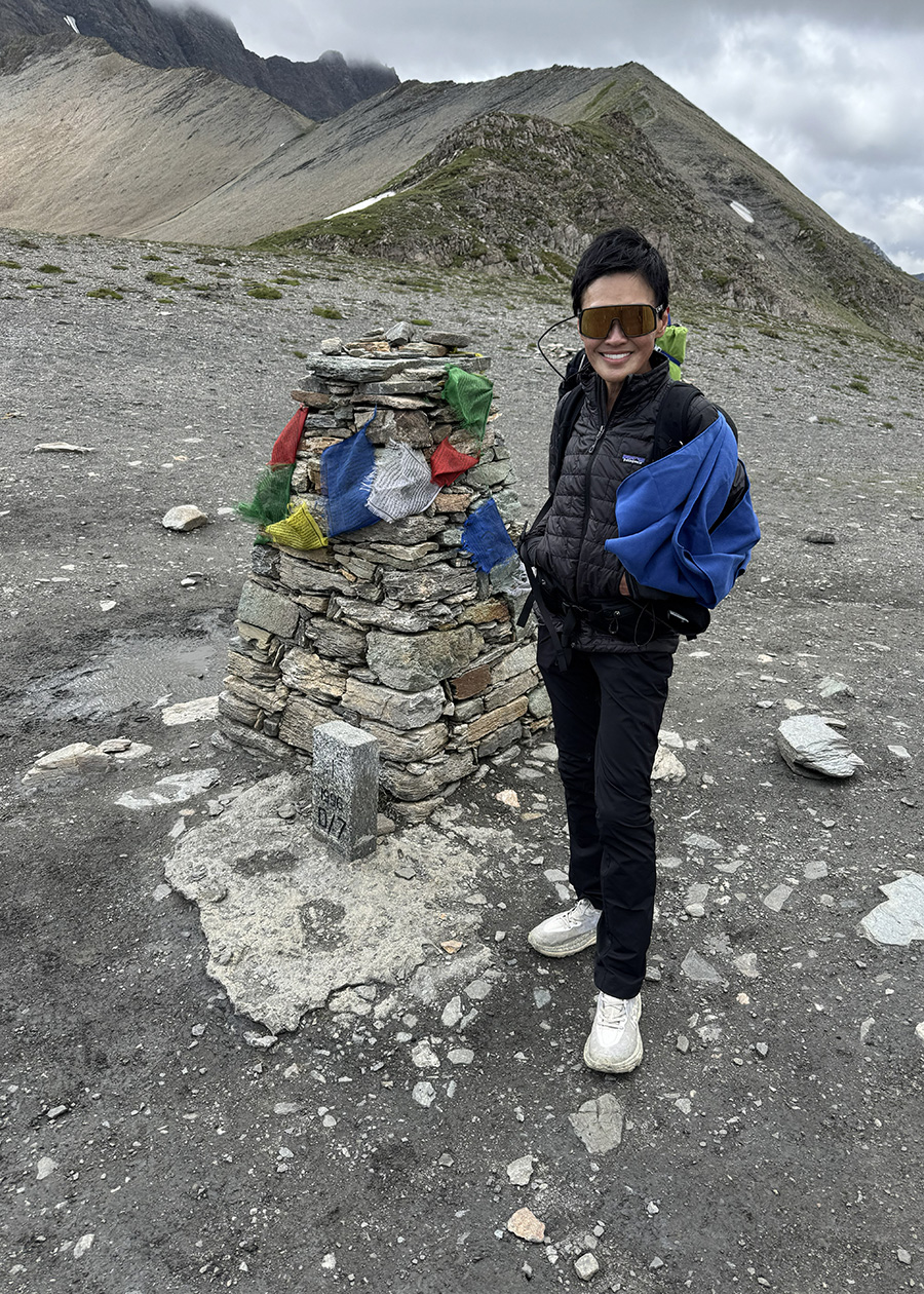 Hơn nửa tiếng đồng hồ sau, tôi mới bước chân vào khuôn viên của Refuge du Col de Balme.  Căn nhà đá vuông vức có hai hàng cửa đỏ rực, trông rất tối giản và rất ấn tượng, như một bức tranh sơn dầu.  Gần đó có một bệ đá đánh dấu biên giới giữa hai nước Pháp và Thụy Sĩ.  Thật là một nơi dừng chân lý tưởng cho khách du hành TMB, một quán biên thùy mà tôi tưởng tượng trong thời chiến, đã có biết bao cuộc gặp gỡ và trao đổi bí mật xảy ra như trong tiểu thuyết.  Nơi đây, ngồi nhâm nhi ly bia, tôi lại được nhìn trọn vẹn rặng Mont Blanc và những ngọn núi khác bao bọc tứ bề.