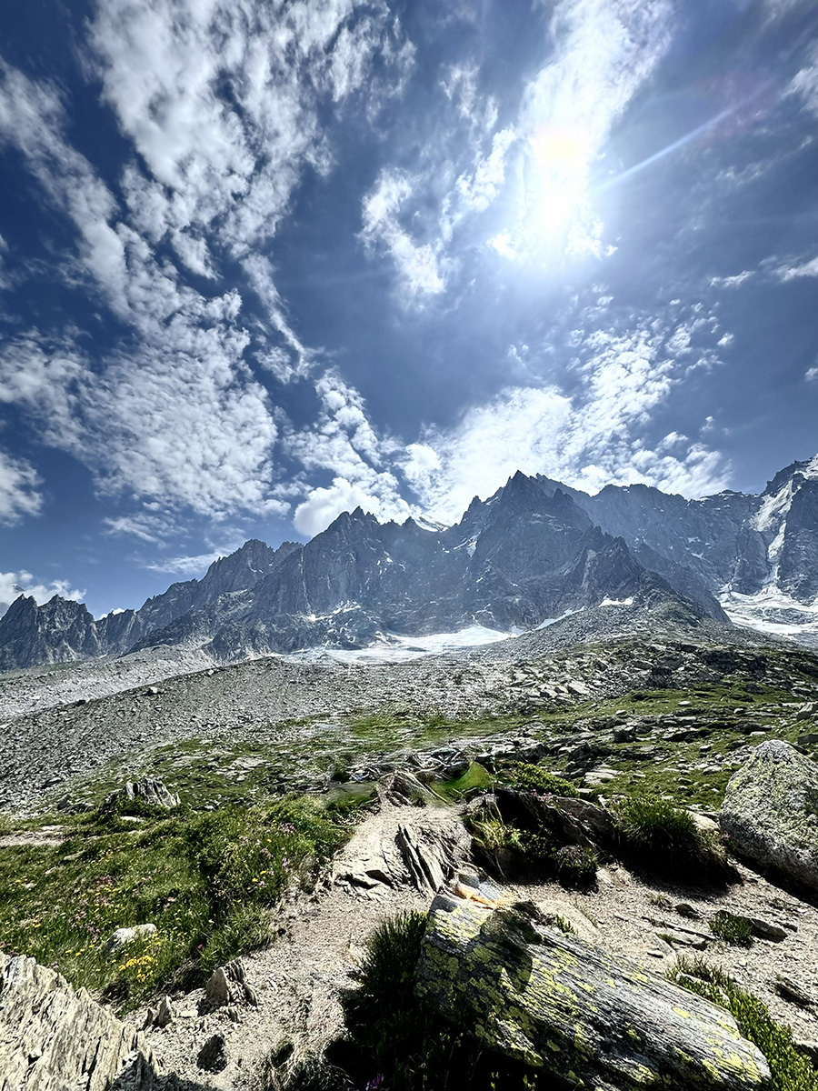 Gió từ trên đỉnh mang hơi tuyết lạnh lẽo cho tôi một cảm giác thật khó tả, nửa uy hiếp, nửa mê hoặc. Quanh tôi, đồi dốc thoai thoải trải xa tít mù.  Lối đi duỗi dài ôm sát sườn núi; hai bên hoa dại nở đầy.  Những đám hoa nhỏ đủ màu sắc, chen giữa những tảng đá bám đầy mảng địa-y (lichen).  Đi một hồi bắt đầu thấy mệt, chúng tôi lại dừng chân ngồi trên mấy phiến đá ven đường, nhìn ngắm trời mây non nước.  Chuyến leo núi hôm nay đánh một vòng 8km (4.5mi) dọc thị trấn Chamonix; đây chỉ là đoạn prologue cho một symphony lừng danh, bản trường ca Mont Blanc sắp tới.