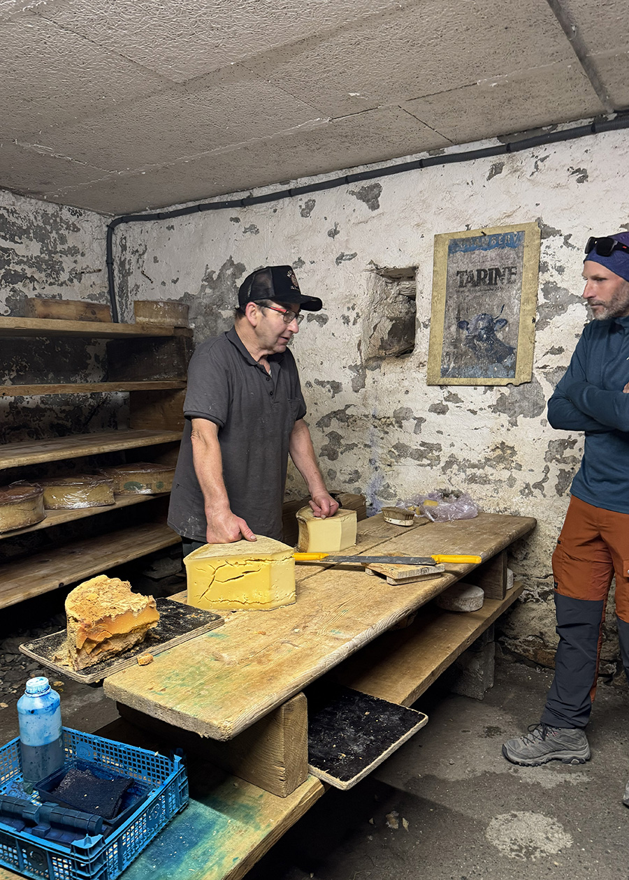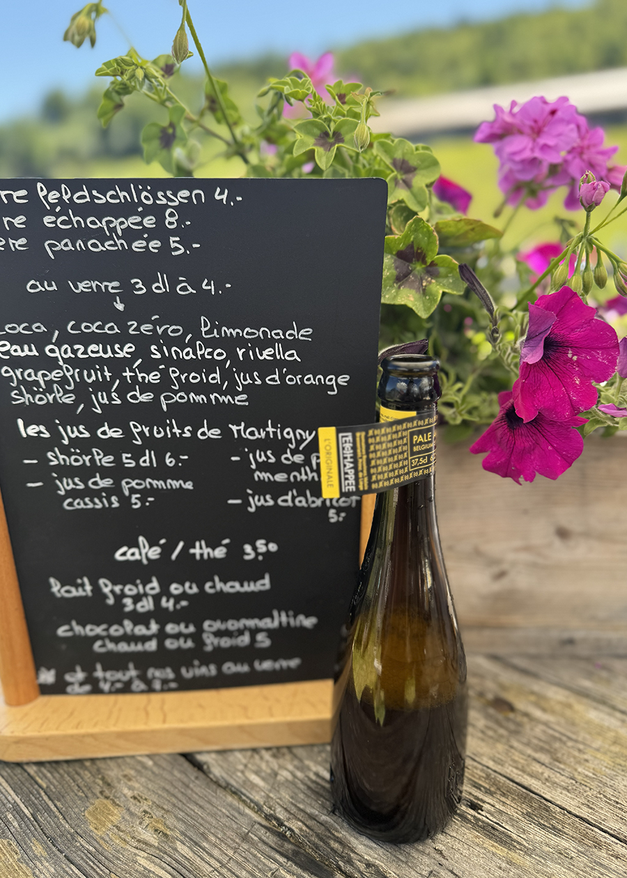 Hôm nay chúng tôi có một “une petite surprise” theo lời của Eric (anh chàng này không biết nhiều tiếng Anh cho nên những câu nói thường có vừa tiếng Anh vừa tiếng Pháp).  Anh dẫn chúng tôi vào một nông trại.  Đường đi quanh co giữa những con bò to lớn đứng gặm cỏ  hoặc nằm phe phẩy đuôi.  Chúng rất thản nhiên, chẳng để ý gì đến đám người lũ lượt kéo đến căn nhà đá gần đó với những hàng bàn ghế gỗ kê chật sân.  Alpage de Bovine, một quán ăn nổi tiếng trong đám trekking.  Bữa ăn đã được đặt trước, món ăn dân dã của người Thụy Sĩ, Rösti, gồm khoai tây chiên dòn, trộn fromage hoặc thịt ba chỉ muối, hoặc cả hai.  Thường thường tôi không chuộng món khoai tây, nhưng trong bầu không khí đồng quê, ngồi giữa cánh đồng cỏ mênh mông cùng với những người đồng hành trong chuyến đi này, với những con bò nằm nhai cỏ nhóp nhép, nắng và gió hiu hiu, cùng với ly bia lạnh, tự nhiên tôi thấy bữa ăn tuy đạm bạc nhưng cũng thật ngon miệng.