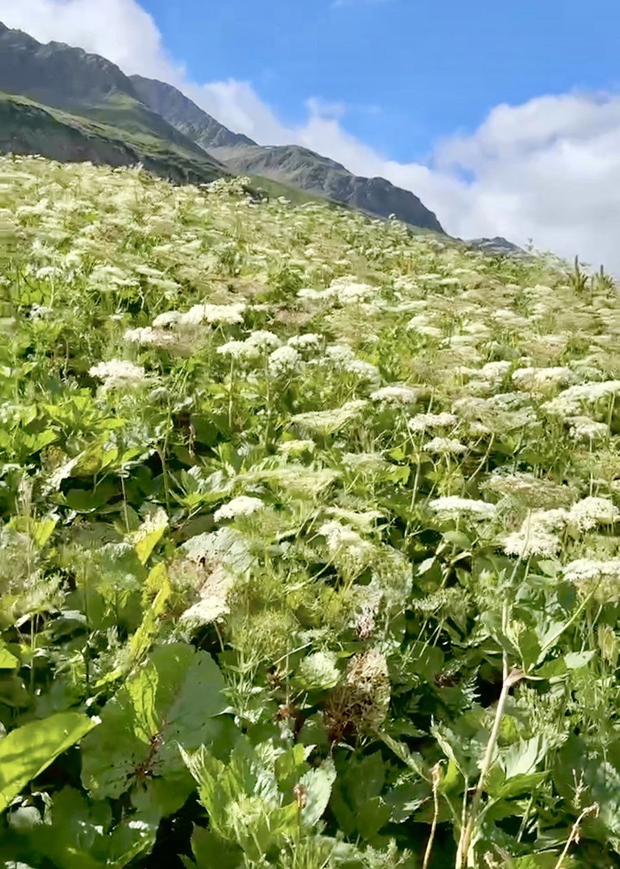Hì hục đi một quãng thì trời bắt đầu lạnh.  Gió se sắt thổi.  Nhìn quanh mới để ý thấy tuyết còn đóng từng mảng hai bên đường.  Nơi đây độ cao là 2.000m (6,562ft).  Tuy vậy, mồ hôi đã rịn ra đầy trán và thấm ướt cả lưng.  Thành thử tôi cũng thầm mừng, đón nhận cái hơi lạnh cần thiết và thật đúng lúc.  Thỉnh thoảng, tôi ngoảnh lại nhìn về hướng cánh đồng bên dưới và tự ngạc nhiên với chính mình đã vượt qua được phần dốc tưởng như không thể nào trèo nổi.