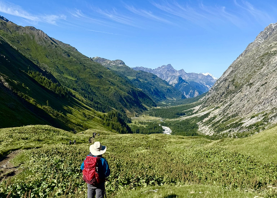 Đoạn đường tiếp tục xuống dốc lại đưa chúng tôi xuyên qua vài nông trại.  Tiếng chuông bò reo vang rộn rã như đuổi theo bước chân đi.  Đường dốc không gắt nhưng lót đầy lá thông và thỉnh thoảng là những bãi… phân bò to lớn đôi khi khó tránh.  Thật là gian nan.  Ra khỏi cánh cổng cuối cùng, lội qua một con suối nhỏ, trèo thêm một đoạn dốc là đến Col de la Forclaz.  Tại đây, Duyên và chiếc xe đã chờ đón tôi và sẵn sàng để đưa chúng tôi về Argentière, một ngôi làng nhỏ trong dãy Alps, nơi tôi vẫn nhìn thấy đỉnh Mont Blanc đang lấp lánh trong ánh nắng chiều rực rỡ.