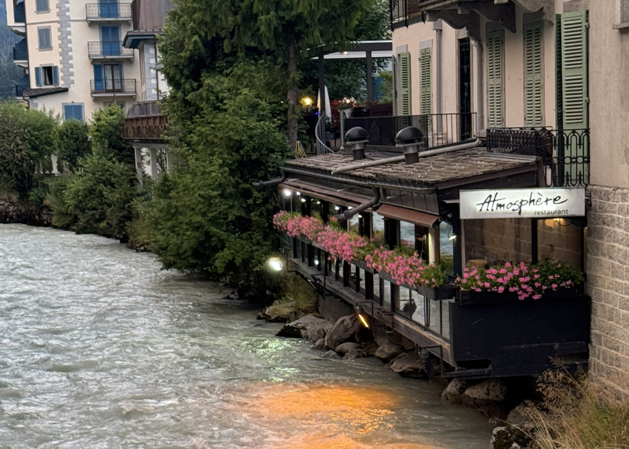Khác với Genève nóng ngột ngạt, Chamonix thật mát dịu.  Ánh nắng ở đây mượt mà là lụa, lại thêm những cơn gió từ rặng núi Mont Blanc hăng hăng mùi băng tuyết đã đánh thức tôi dậy. Trưa thị trấn nhốn nháo tiếng cười nói cùng tiếng nhạc từ nhà hàng, quán kem, quán cà phê.  Thật tưng bừng.  Đến nỗi mặt trời cũng không chịu lặn cho đến sau 9 giờ tối.  Trong ánh chiều chập choạng, cái lạnh thấy lâng lâng thật sảng khoái, như chứa trăm điều hứa hẹn.